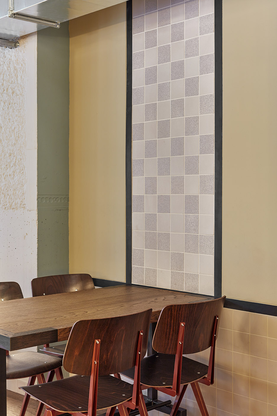 Prima della ristrutturazione, il motivo delle piastrelle che riempiva l'interno mostrava visibilmente lo scorrere del tempo. Vecchie e nuove piastrelle, con diverse dimensioni e colori affiancati. La varietà di colori, forme e modelli ha ispirato la nuova tavolozza di materiali