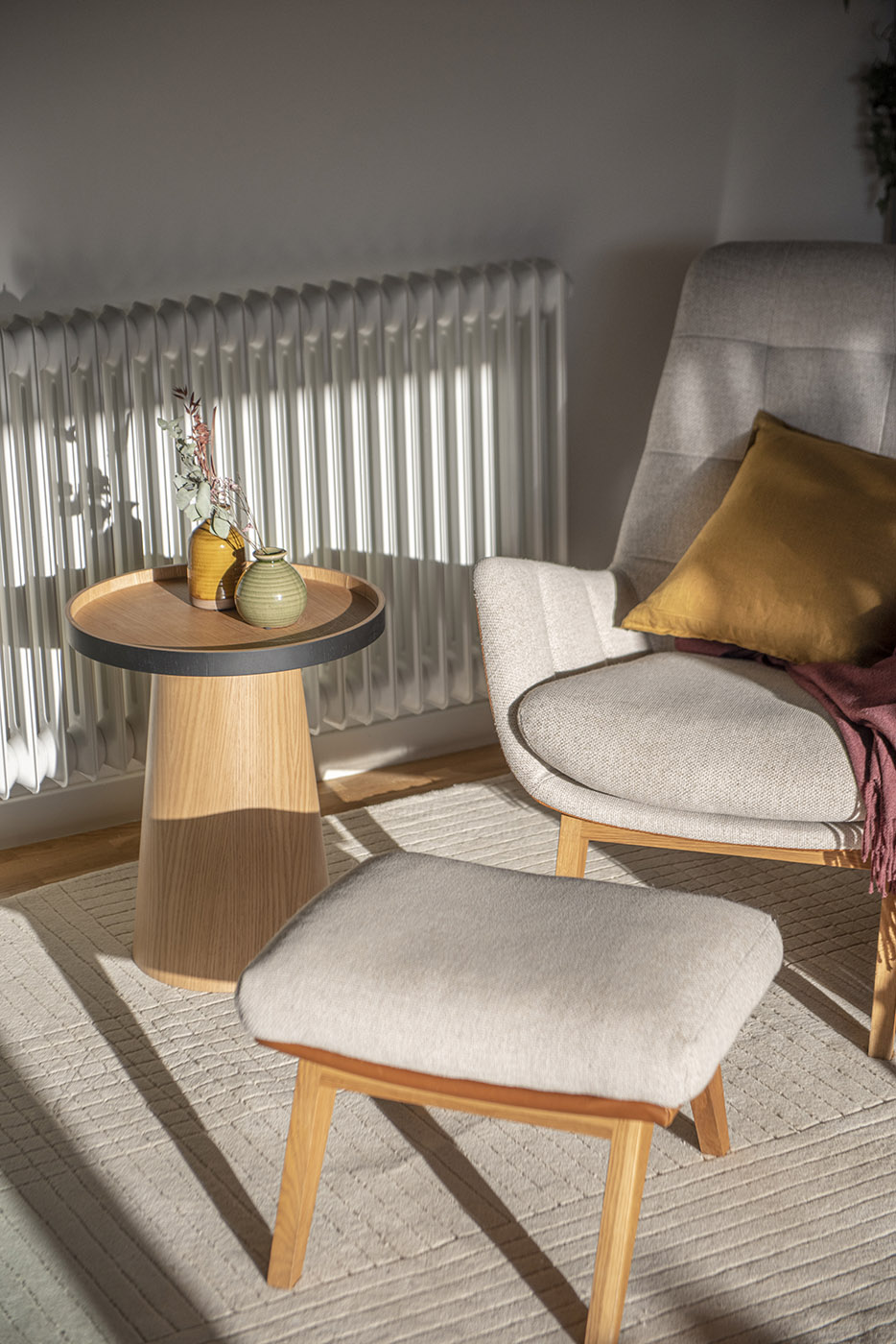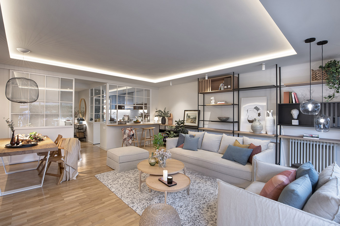 La collezione dei mobili è eclettica: integra mobili minimalisti e nordici con mobili provenzali e urbani, con una tavolozza di toni neutri caldi e accenni di saturazione. La cucina si affaccia sulla sala da pranzo, che a sua volta si affaccia sulla terrazza, dove la famiglia ama riunirsi, a differenza del piano superiore che, invece, garantisce raccoglimento, intimità e isolamento, e prevede una camera con bagno privato