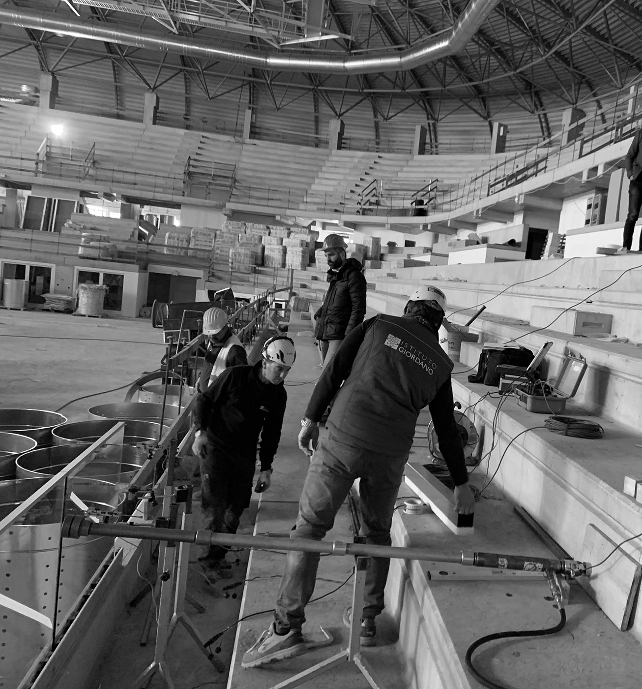 Il progetto è stato portanto avanti con bozze e studio di fattibilità, adeguamenti normativi, verifiche statiche relative ai vari nodi di fissaggio, progetto esecutivo con scelta della soluzione da adottare, verifiche in loco e in ultima istanza con il collaudo di Istituto Giordano che ha portato a valori raggiunti durante la prova, particolarmente rilevanti (valori di spinta pari a 900 kg/m) andando ben oltre i limiti previsti dalla normativa.