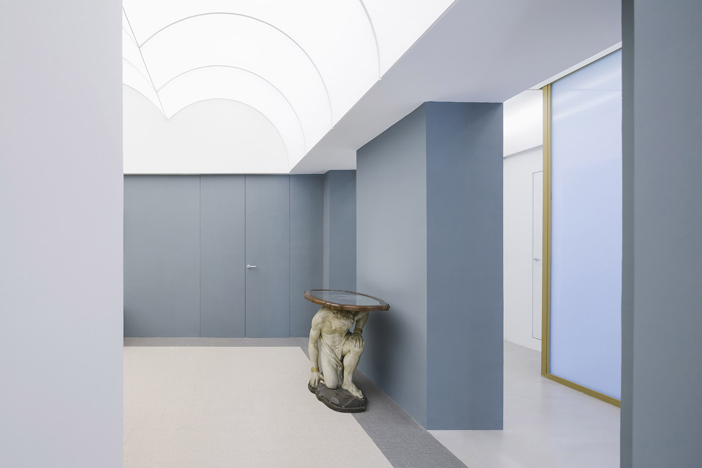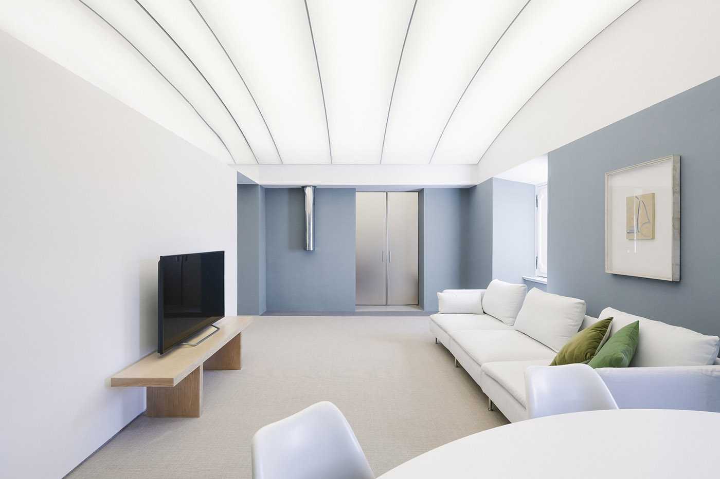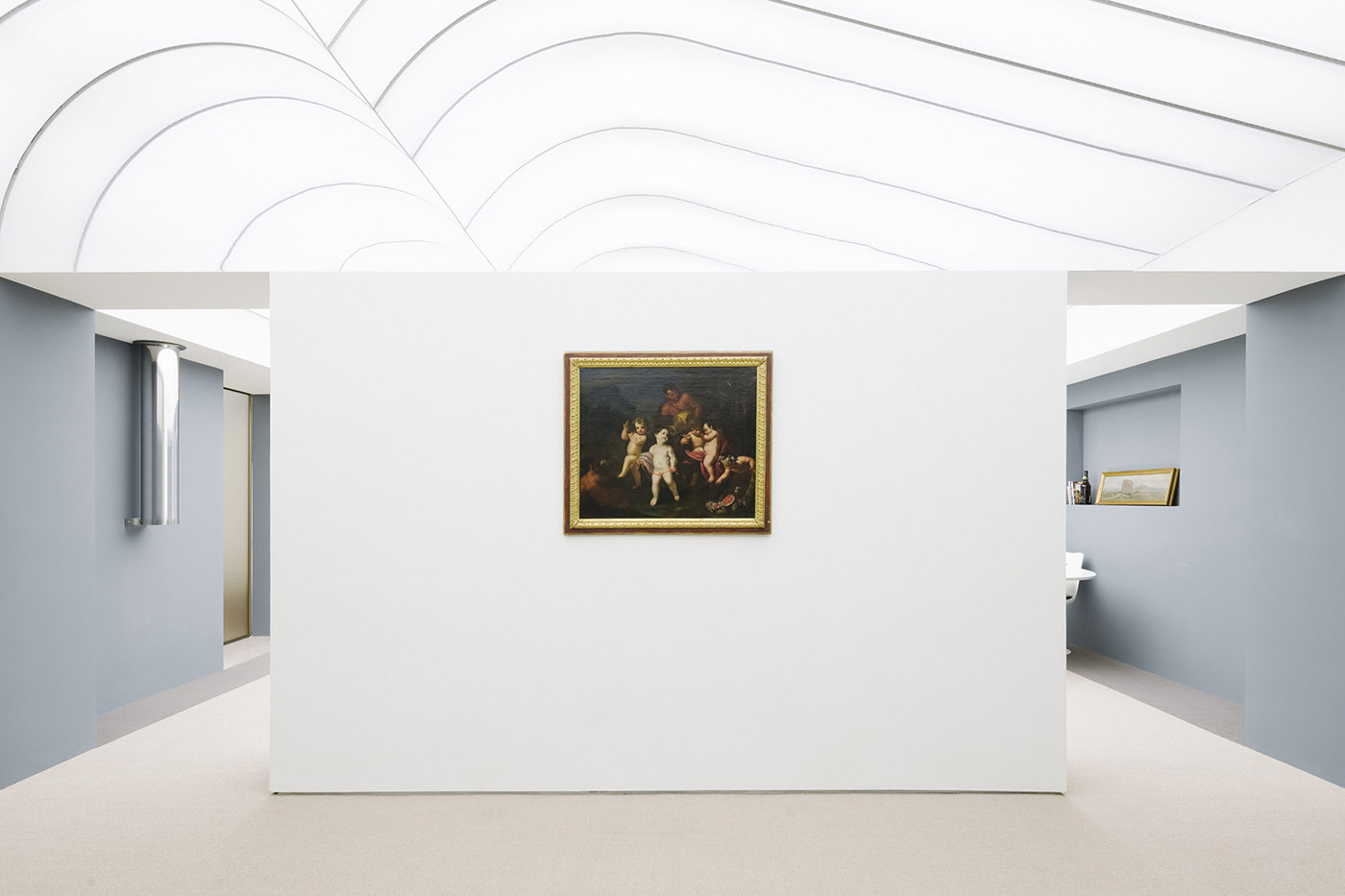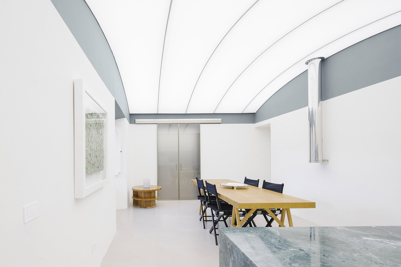 Gli ambienti sono caratterizzati dalla combinazione di superfici bianche astratte e una luce soffusa che fanno da sfondo alla collezione di oggetti e di quadri del cliente. Lo spazio viene anche arricchito e articolato tramite l'uso di specchi che riflettono le volte e alterano la percezione e la dimensione dello spazio interno