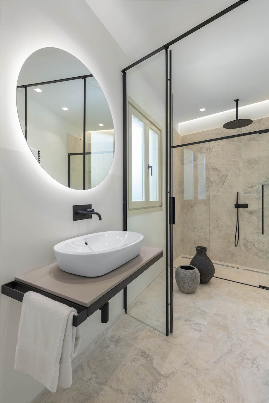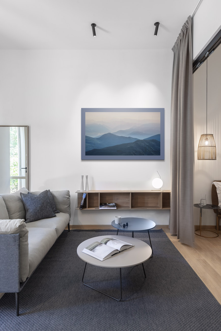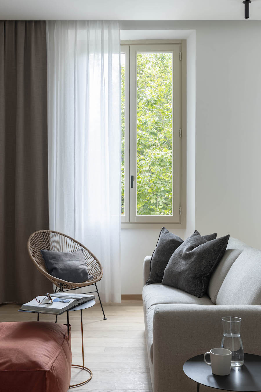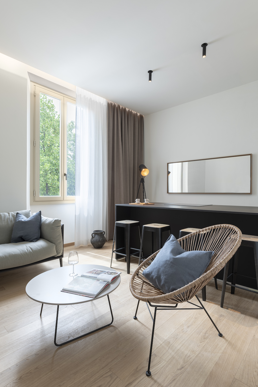 Le pareti sono bianco pure e gli arredi sono raffinati, con suggestioni naturali date dall'uso del legno nel parquet e il travertino nei bagni. Grazie a dei tocchi di tonalità più calde, come le tinte pastello degli imbottiti, gli ambienti acquisiscono personalità e dinamismo. Grazie alla presenza di un piccolo giardino sul retro, gli ospiti possono godere di un'area relax outdoor