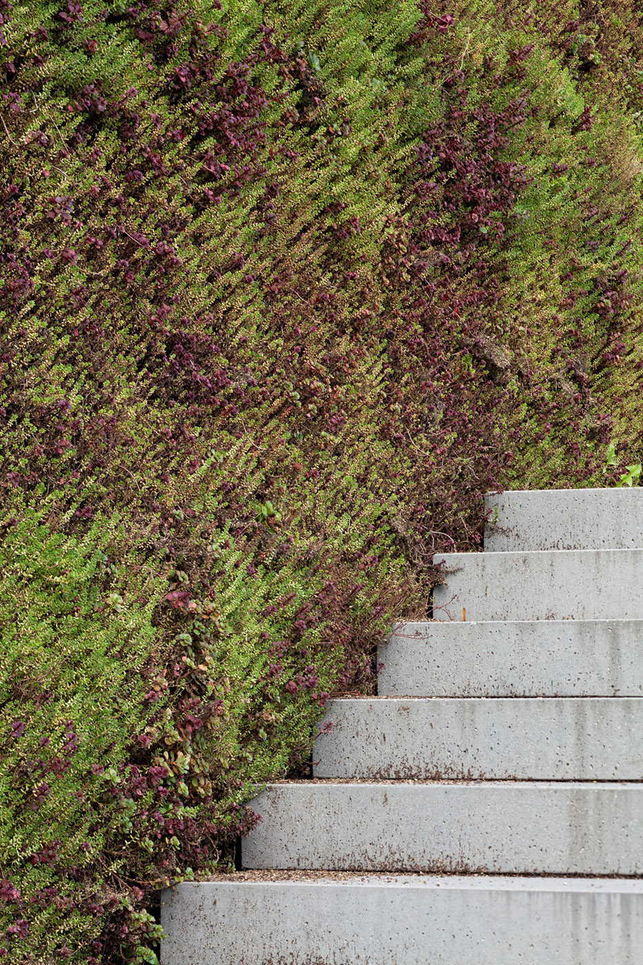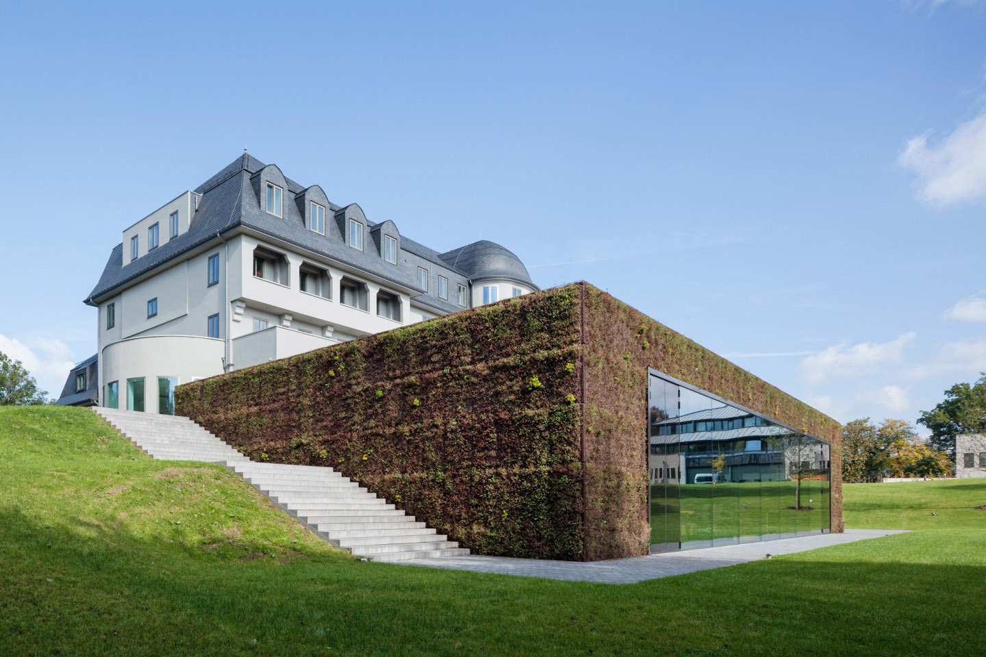 L'estensione si posiziona di fronte all'edificio esistente, e grazie alla sua facciata e al suo tetto verde si mimetizza con il paesaggio, incorniciando il sanatorio che domina sulla collina. La facciata anteriore del nuovo edificio è completamente vetrata, minimizzando il confine tra interno ed esterno