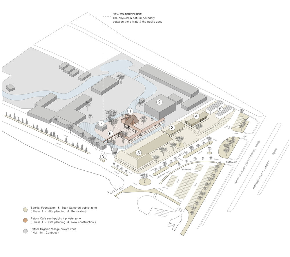 Il terreno pubblico si estende per 20.000 metri quadrati, e comprende il Patom Cafe, di nuova costruzione, dei magazzini rinnovati per il Patom Shop, il mercato Sookaj e l’Accademia Sookaj. NITAPROW Architects progetta questo luogo pronto ad accogliere un sistema alimentare sostenibile e guidare lo sviluppo dell’agricoltura biologica a Nakorn Pathom de nelle province limitrofe