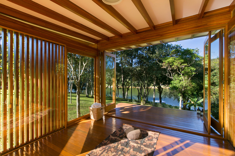 Il padiglione in legno, progettato dallo studio brasiliano DT estudio a San Paolo, risponde alle esigenze dei propri clienti, che desideravano un padiglione come un blocco isolato, in cui poter mediare e poter stare in contatto con la natura
