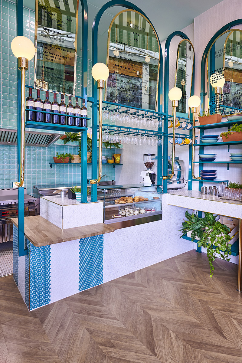 Per il concept era necessario progettare uno spazio che trasmettesse l'origine italiana dal prodotto in vendita, inclusi i suoi elementi tradizionali e ingredienti naturali. Lo spazio sovrastante richiedeva di ricordare il passato, ma attraverso un'estetica moderna, per questo fin dall'inizio Masquespacio ha optato per l'uso di piastrelle dall'aspetto artigianale, oltre a una serie di elementi come le lampade a sospensione e gli archi con specchi che ci ricordano i tradizionali bar dell'antica Italia