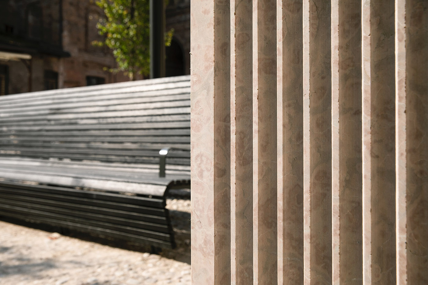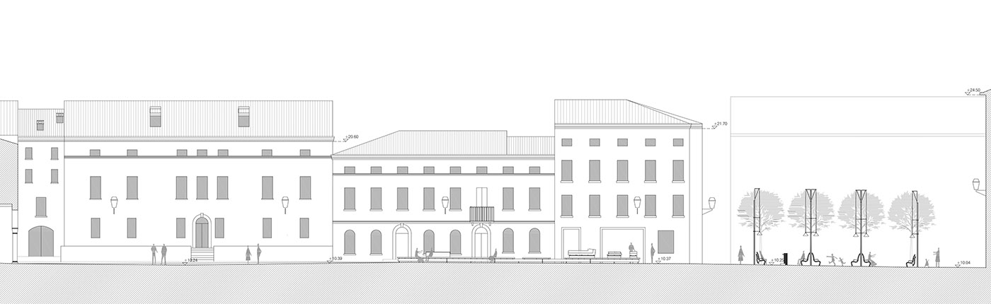 L'area sulla quale sorgeva il chiostro sarà ancora individuabile nella sua struttura geometrica grazie all'utilizzo di lastre di pietra bianca che definiscono il perimetro del chiostro porticato