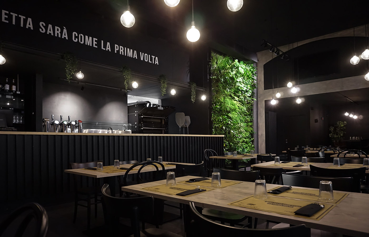 Tutto avviene e ruota attorno al cuore del ristorante, caratterizzato da una grande parete vegetale, con vere essenze arboree, che si innalza al centro dell'open space, enfatizzando la genuinità dei prodotti utilizzati nei piatti proposti e l'approccio green e sostenibile del ristorante