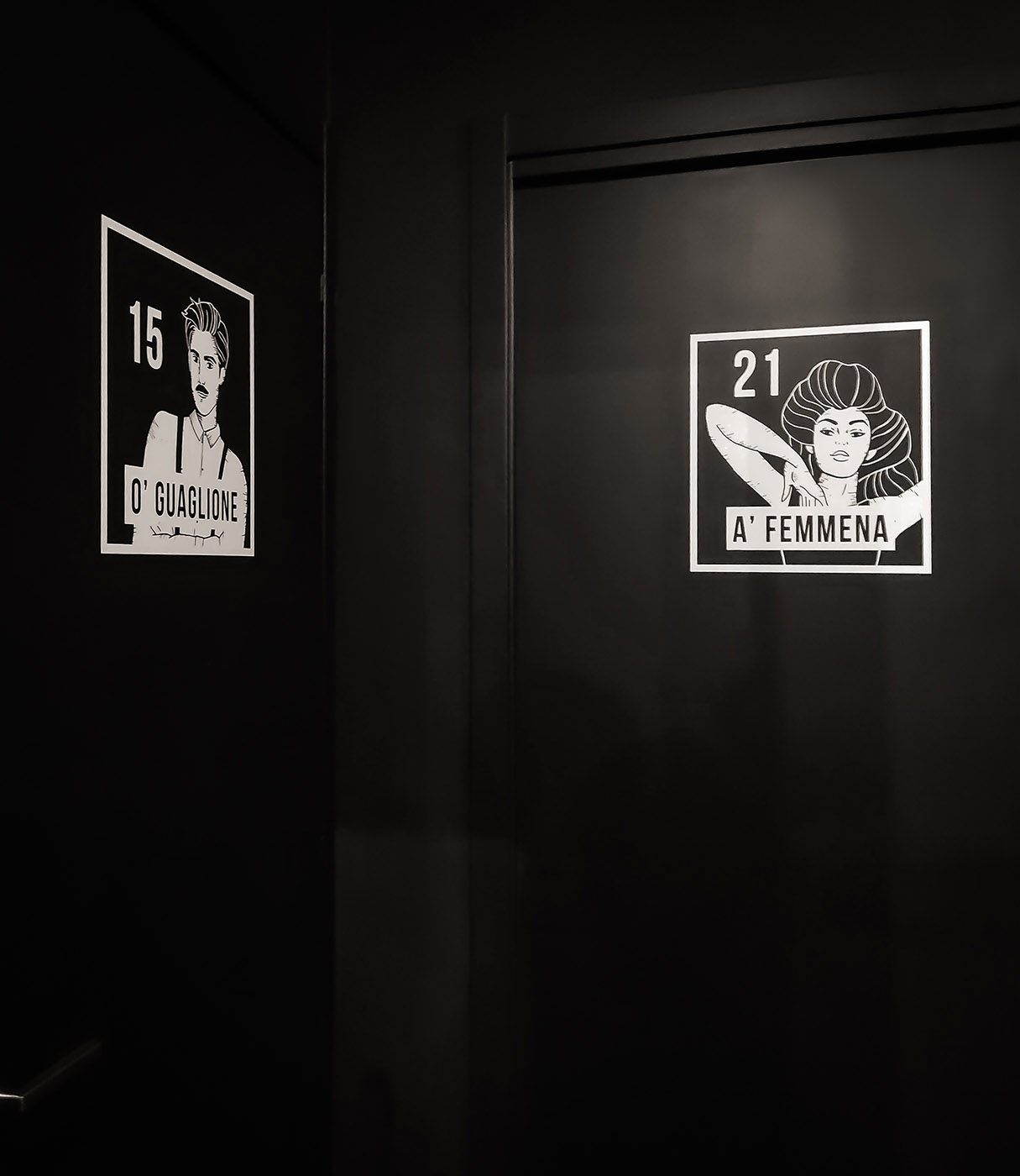 Gli spazi interni sono scanditi da pareti scure che creano zone di penombra, in cui emergono elementi della tradizione napoletana, come le maschere di Pulcinella. Delle superfici a listelli neri verticali, dal sapore orientale, contrastano con le pareti monocromatiche, conferendo leggerezza e creando giochi di luce