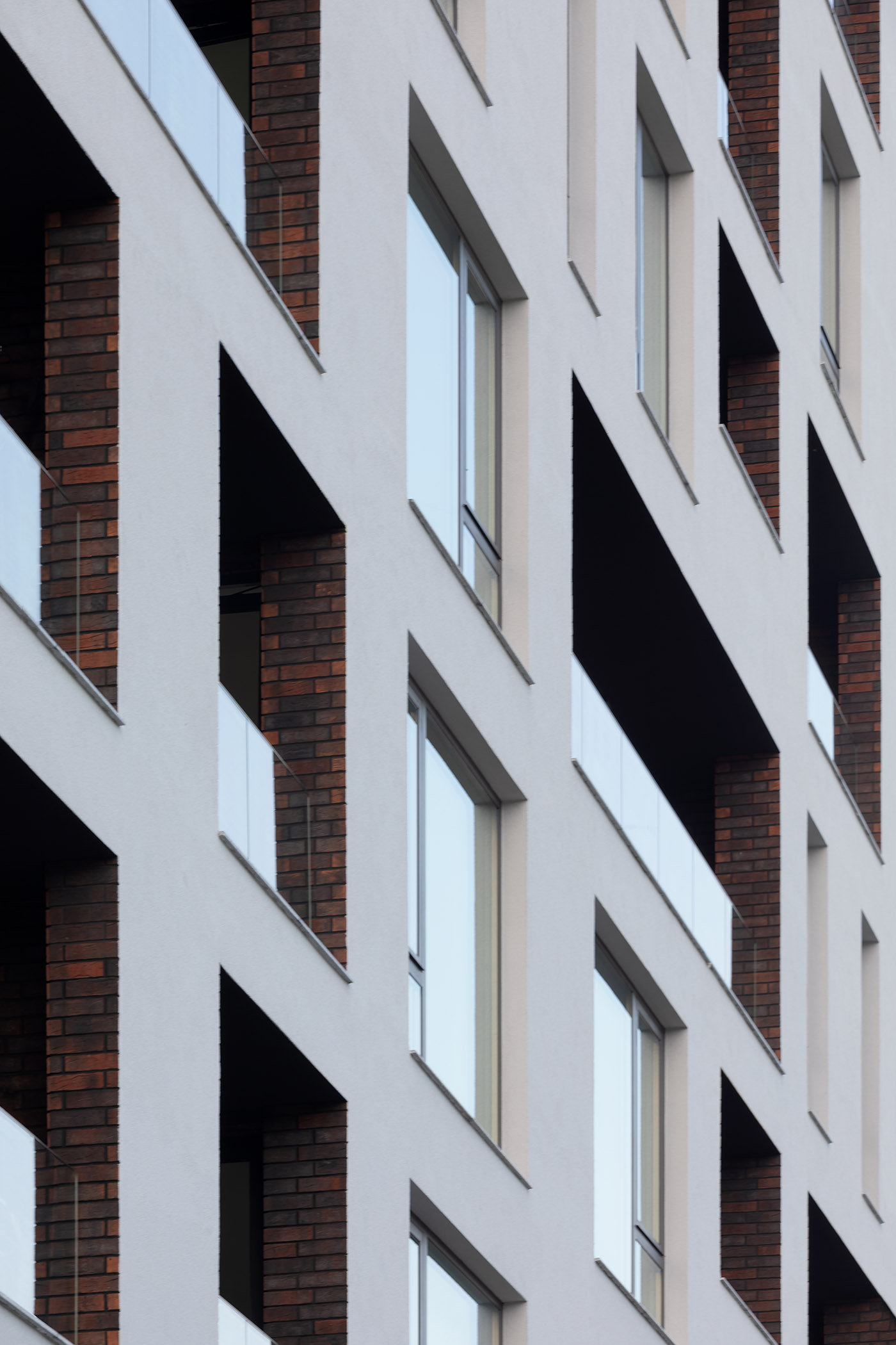 Al piano terra dell’edificio ad uso misto si trova una “palestra boutique”: un fitness club contemporaneo aperto 24/7, dove non è necessario personale e l'accesso è controllato tramite app. Nei piani superiori, appartamenti e uffici sono progettati in modo molto simile, seguendo il principio del comfort domestico portato all’interno degli spazi di lavoro