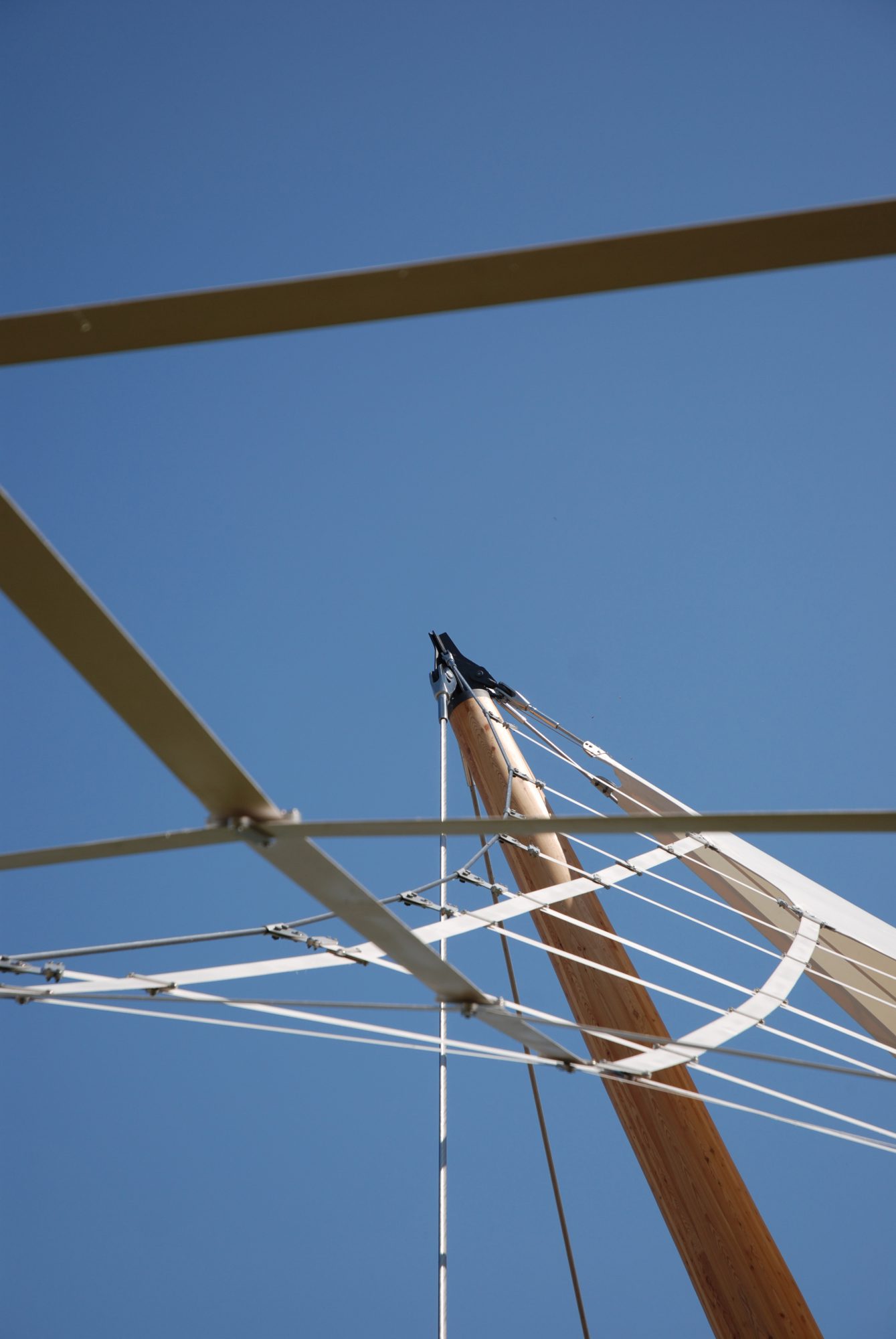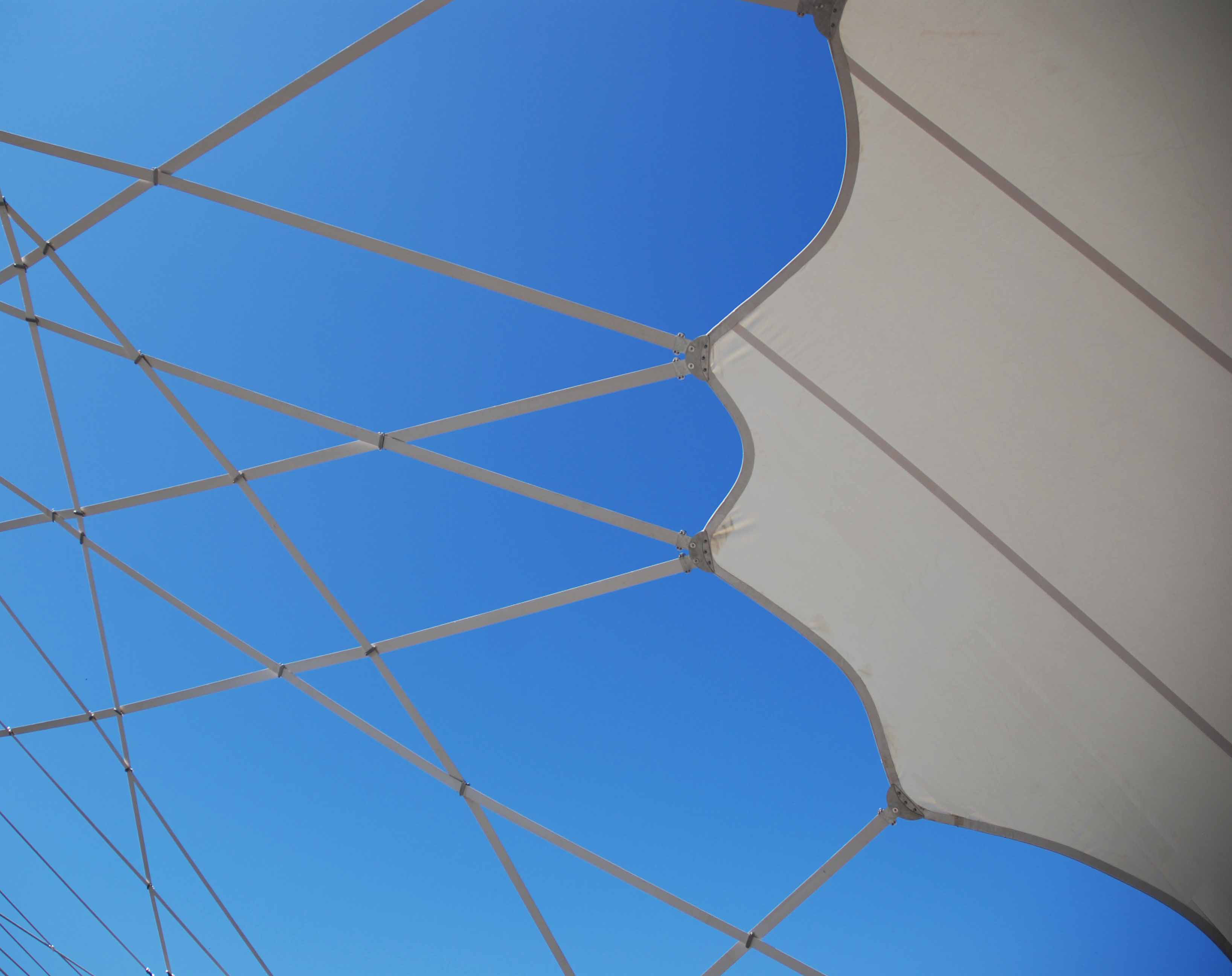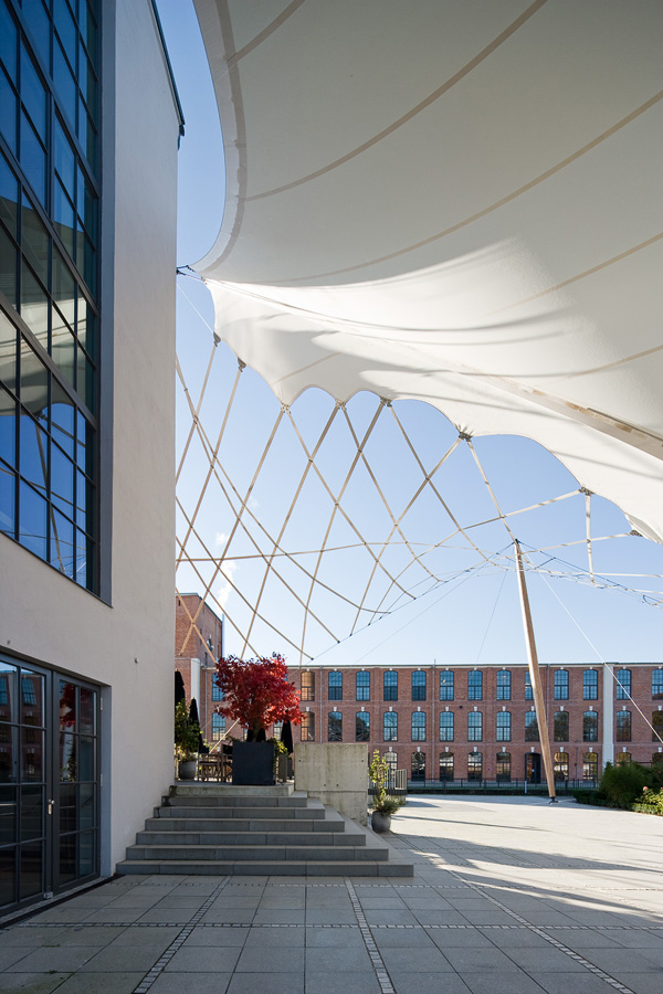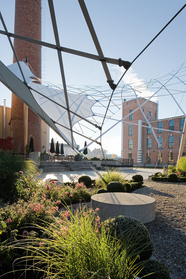 Il risultato è una copertura in membrana tesa che ricopre la terrazza adiacente al "locale caldaie". Quattro pilastri in legno collegati organicamente da una rete, hanno forme circolari chiare. Di notte, le luci puntuali a led li illuminano dal basso. La combinazione dei due sistemi strutturali di trazione si compone di un cavo, una rete e una membrana. La sfida nel coniugare gli elementi leggeri nel sistema di tensostruttura realizzato risiede nelle diverse modalità in cui cavo, rete e membrana di rispondono ai carichi esterni: come la neve o vento