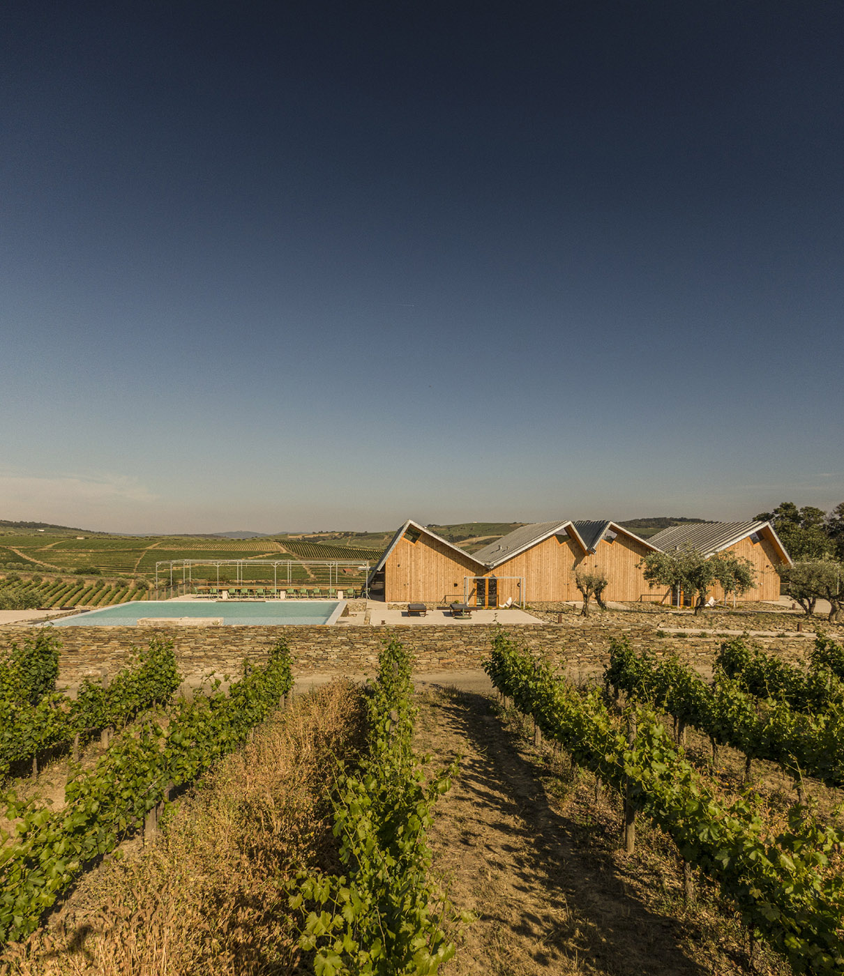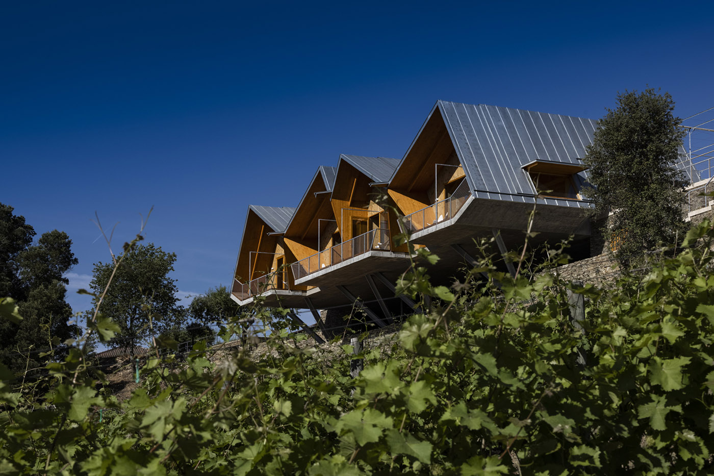 Siamo sospesi nel paesaggio: completata la ristrutturazione dell'Adega da Quinta da Faisca, nasce la necessità di alloggi per visitatori che si innalza sulle vigne, sulle case esistenti e sulla cantina stessa