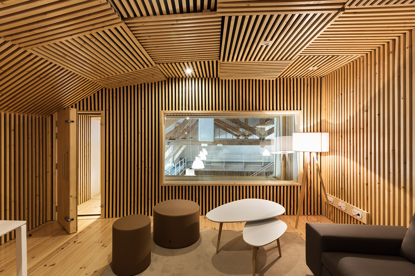 La diversità di materiali utilizzati si traduce in esperienze multisensoriali differenti, derivanti anche dall'effetto acustico creato in determinati spazi. Tra esterno ed interno c'è un forte contrasto: il primo ampio e luminoso, il secondo chiuso, caratterizzato dal materiale legno e dal giorno di trame diversificate, colori e illuminazione diversa che influenzano la percezione di ogni spazio