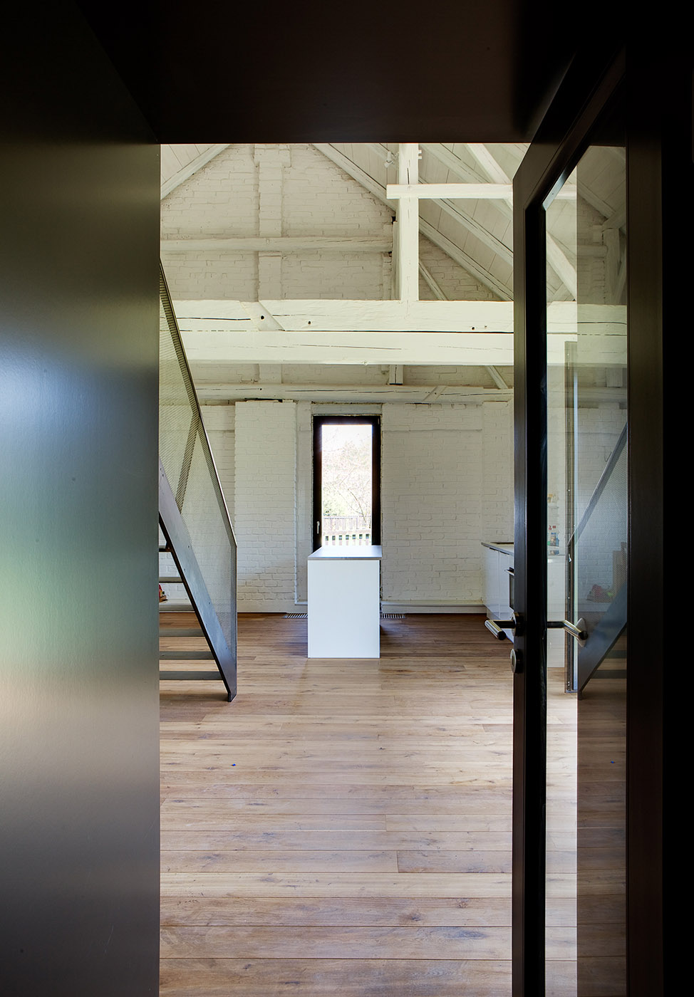 L'intelaiatura originale del tetto è stata mantenuta insieme alle pareti, e sono state unificate con una vernice bianca. Una nuova porta permette l'accesso alla stalla, creando un nuovo passaggio. Le nuove zone giorno sono isolare dall'esterno tramite un rivestimento in lana minerale e l'intonaco di calce nella parte anteriore è stato ristrutturato