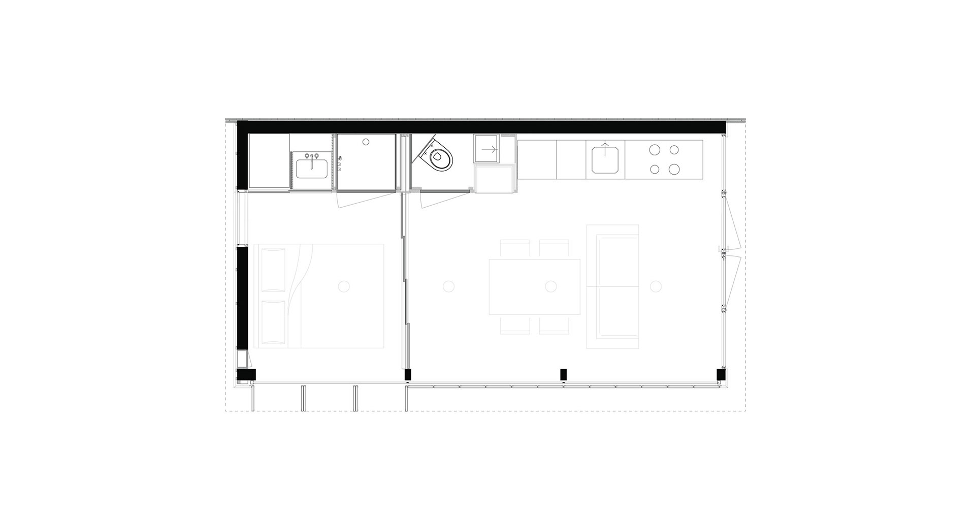 Sul lato lungo della facciata chiusa vi sono tutti i servizi accuratamente integrati in un muro di rovere: cucina, forno a legna, un WC, la doccia, un lavabo e diversi armadi. Anche il basamento della cucina è progettato come un cassetto ... ogni minimo spazio della casa è stato utilizzato e pensato