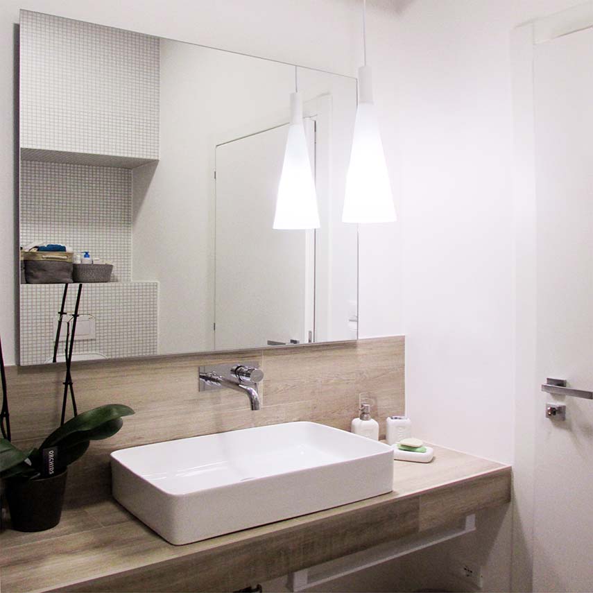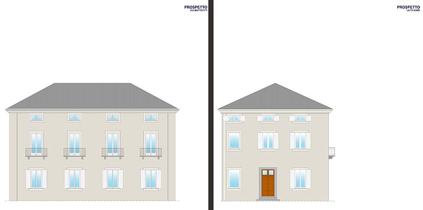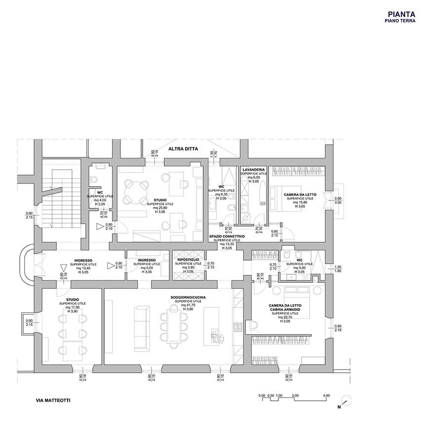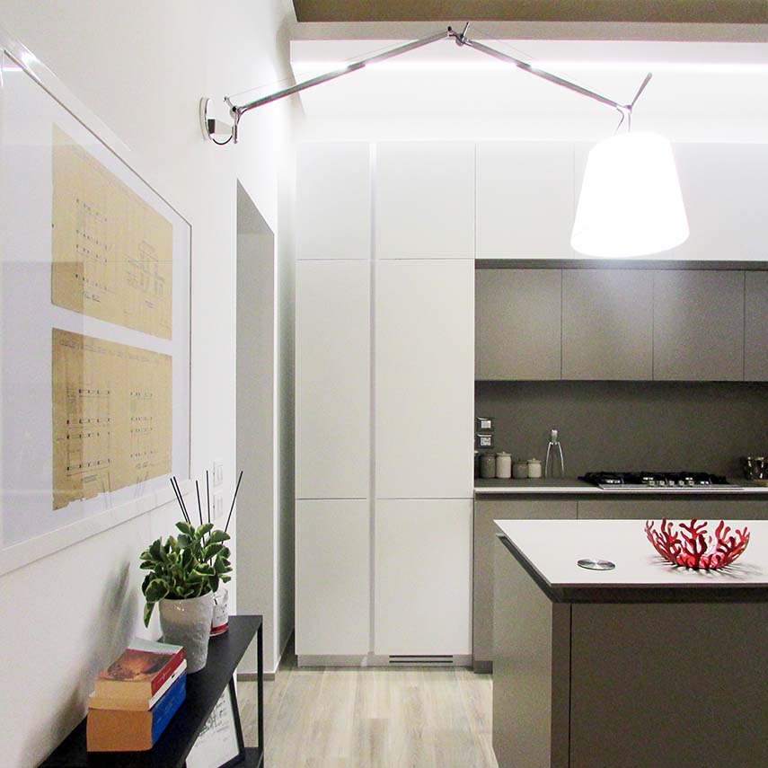 Il piano terra del palazzo viene completamente ristrutturato e dedicato a residenza e studio. La nuova distribuzione interna rispetta la struttura originale portante, integrata con tramezzi aggiuntivi. L’ex sala professori, un ampio salone affrescato, diventa il nuovo living con cucina a vista: il forte contrasto delle forme pure dei nuovi elementi architettonici e della linearità dell’arredo contemporaneo con l’opulenza della decorazione antica, parte da questo ambiente e rimane il fil rouge di tutto l’intervento. L’abitazione si sviluppa poi con una camera padronale con cabina armadi e bagno esclusivo, una seconda camera da letto e i locali di servizio consistenti in un secondo bagno, un ripostiglio e una lavanderia. Allo stesso piano trovano posto uno studio di 25 mq con bagno e una sala riunioni di 17