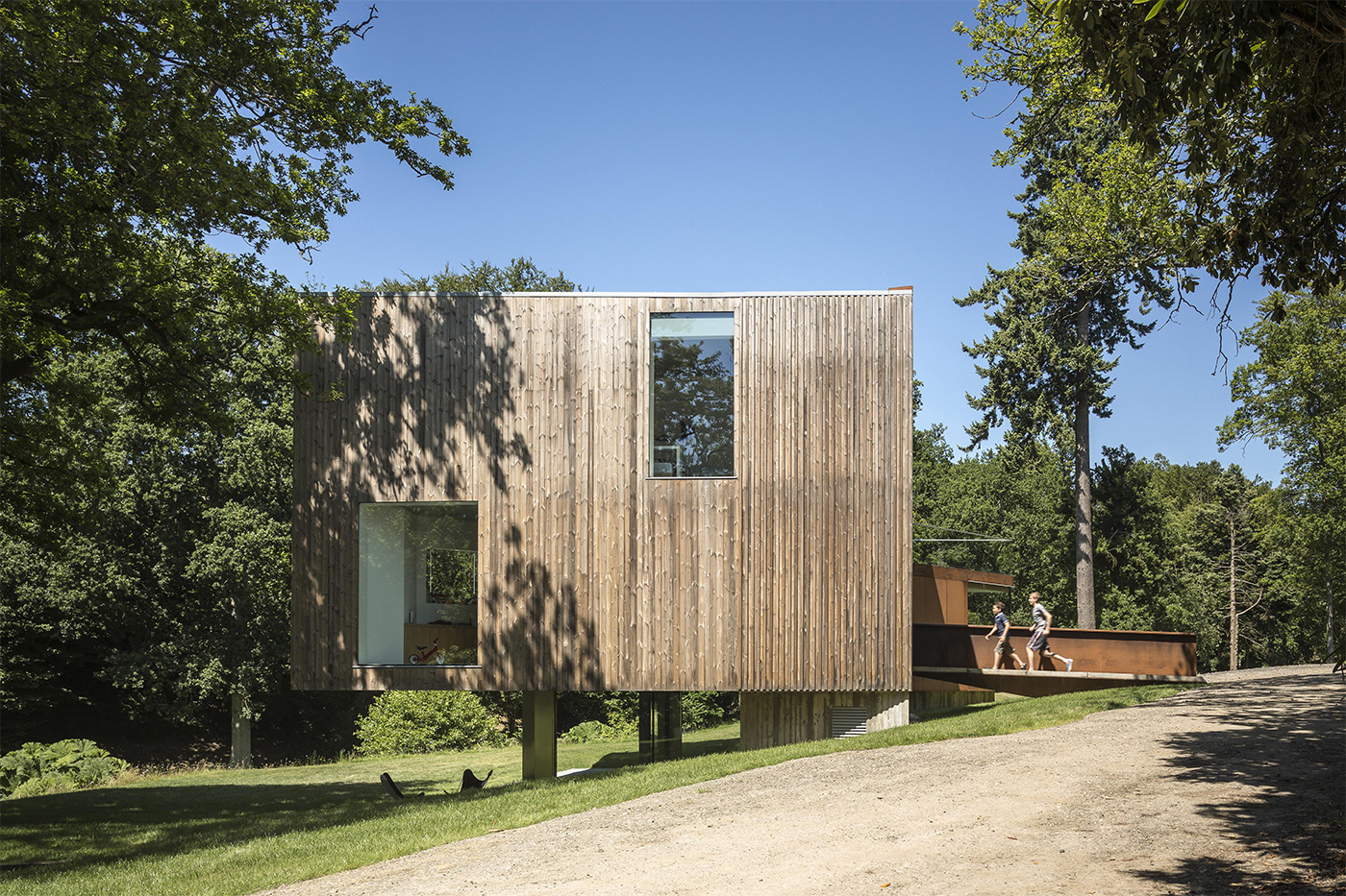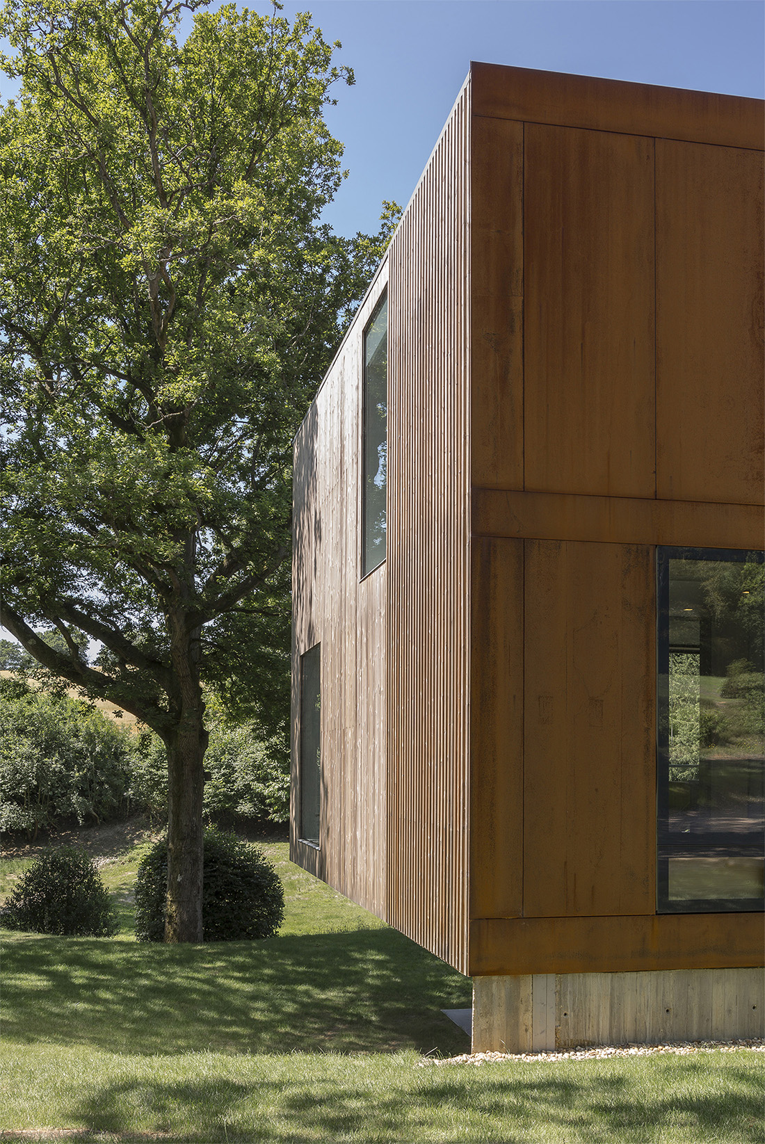 Il quarto lato che si affaccia sul viale d'ingresso è rivestito in pannelli di acciaio corten la cui superficie ossidata echeggia la tonalità autunnale degli alberi intorno e rivestimenti di legno adiacenti