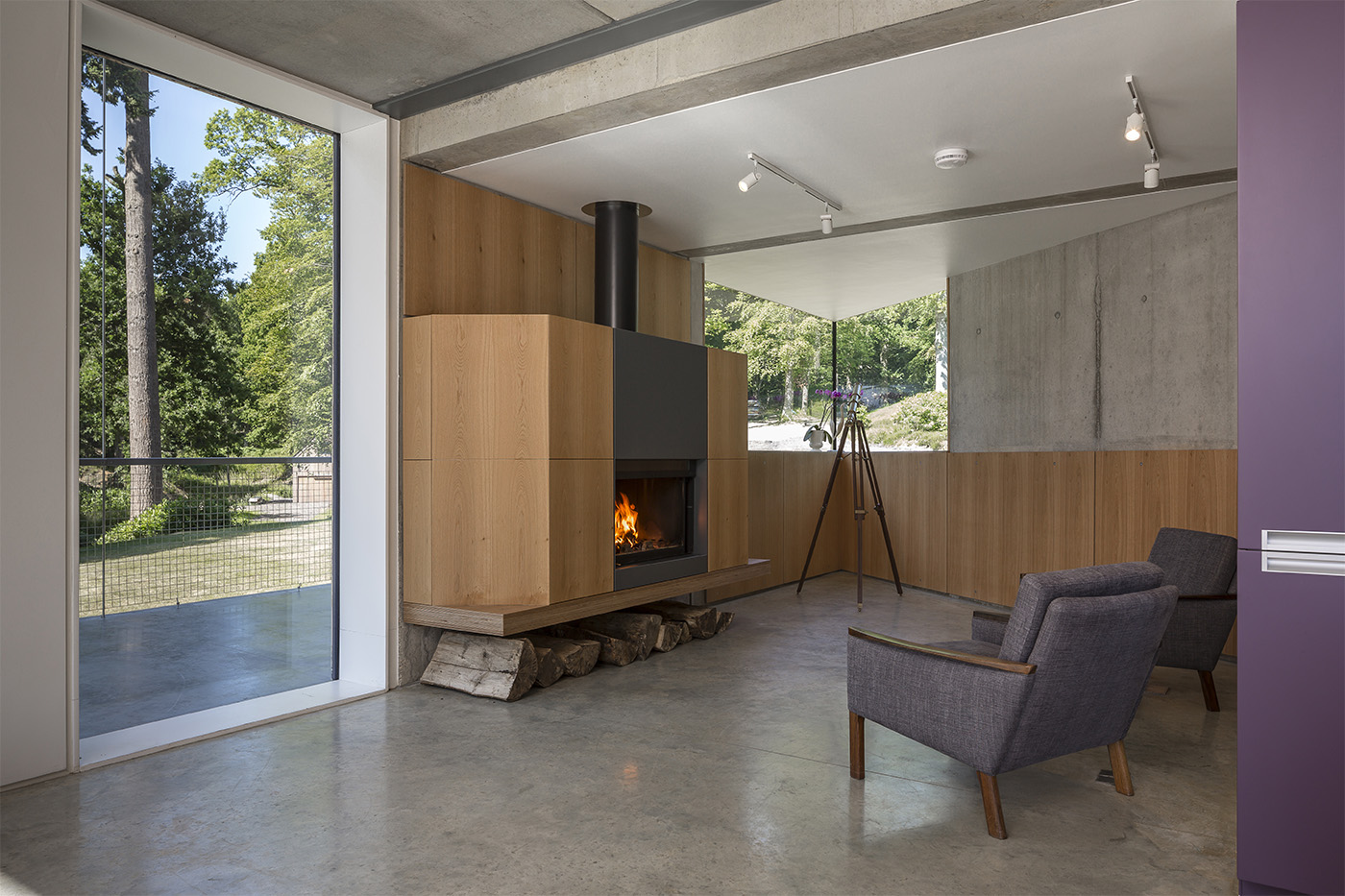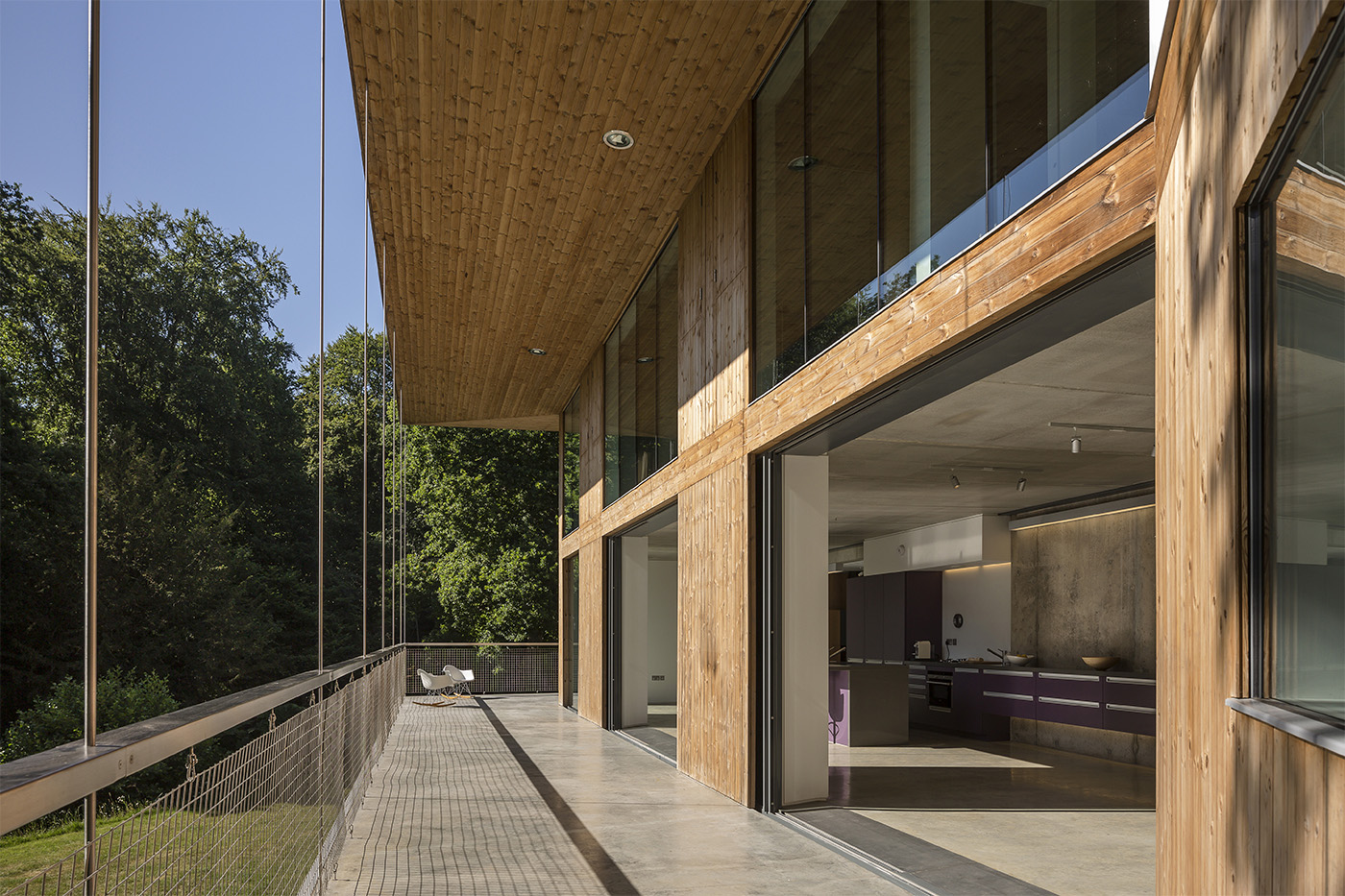 Arredati su tre livelli, i principali spazi abitativi, accessibili tramite un ponte piatto piegato in acciaio, occupano il pavimento centrale e conducono ad una generosa veranda appesa e protetta dal tetto sovrastante