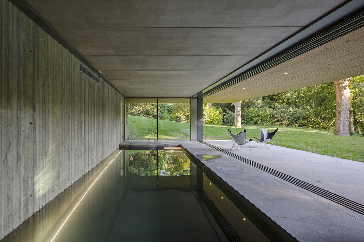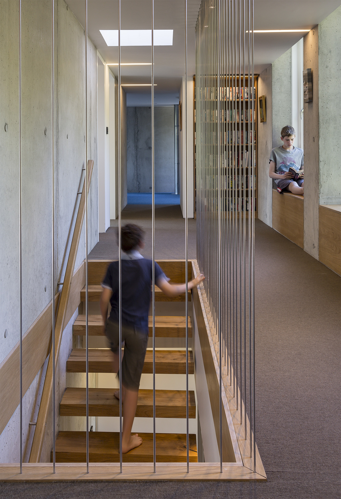 Le scale in quercia massiccia lavorate con legname dal bosco e sbalzate dalle pareti di calcestruzzo di supporto conducono fino al pavimento della camera da letto o giù ad una striscia di spazi pubblici e attraverso una sala da piscina la cui parete di vetro scorrevole si apre alla terrazza coperta e prato circostante