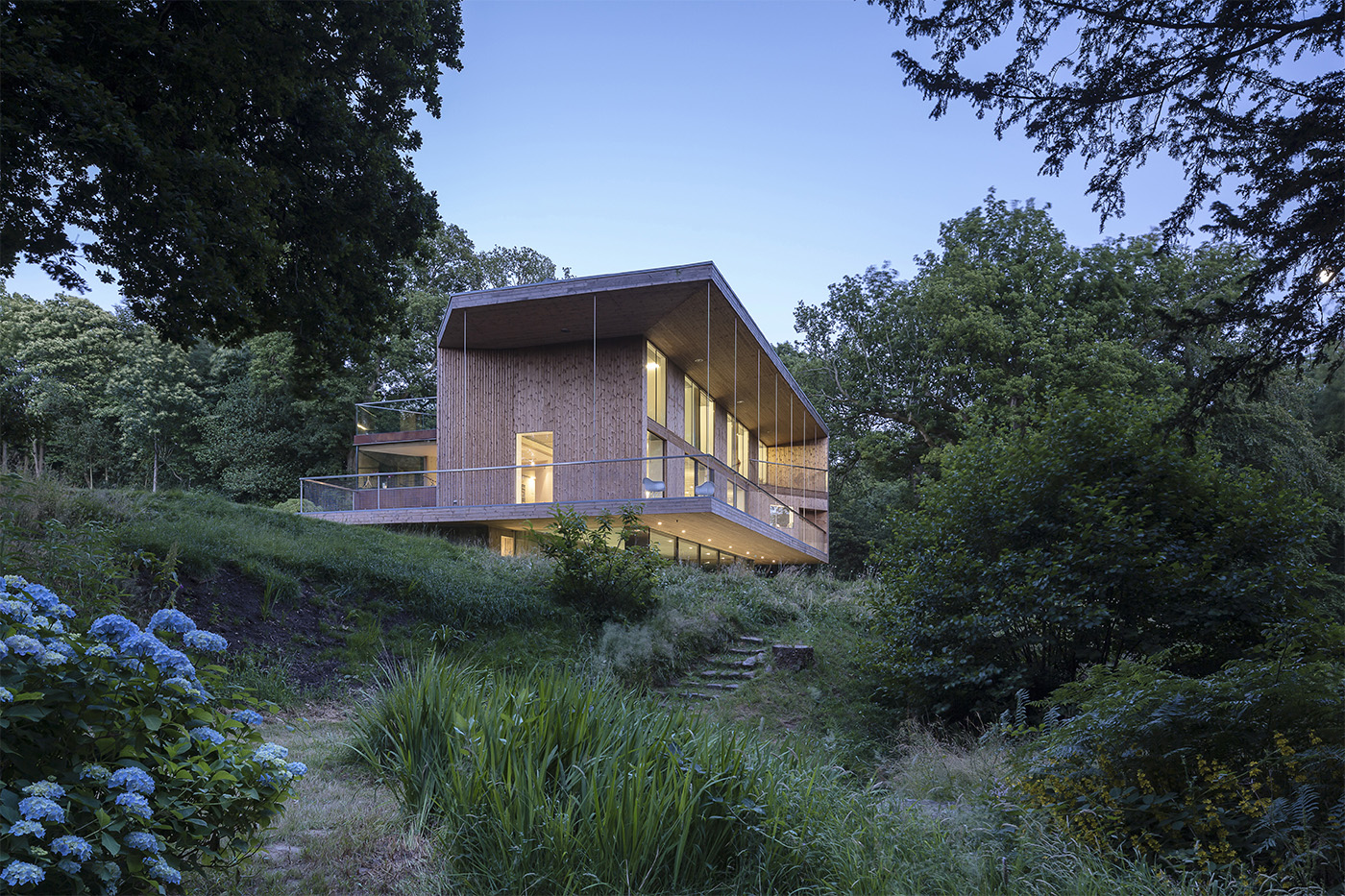 In una zona di boschi antichi che confina con la foresta di Ashdown a East Sussex, nel Regno Unito, il nuovo edificio costruito da Smerin Architetti si trova in una collina che domina un torrente e le terre coltivate a Wealden