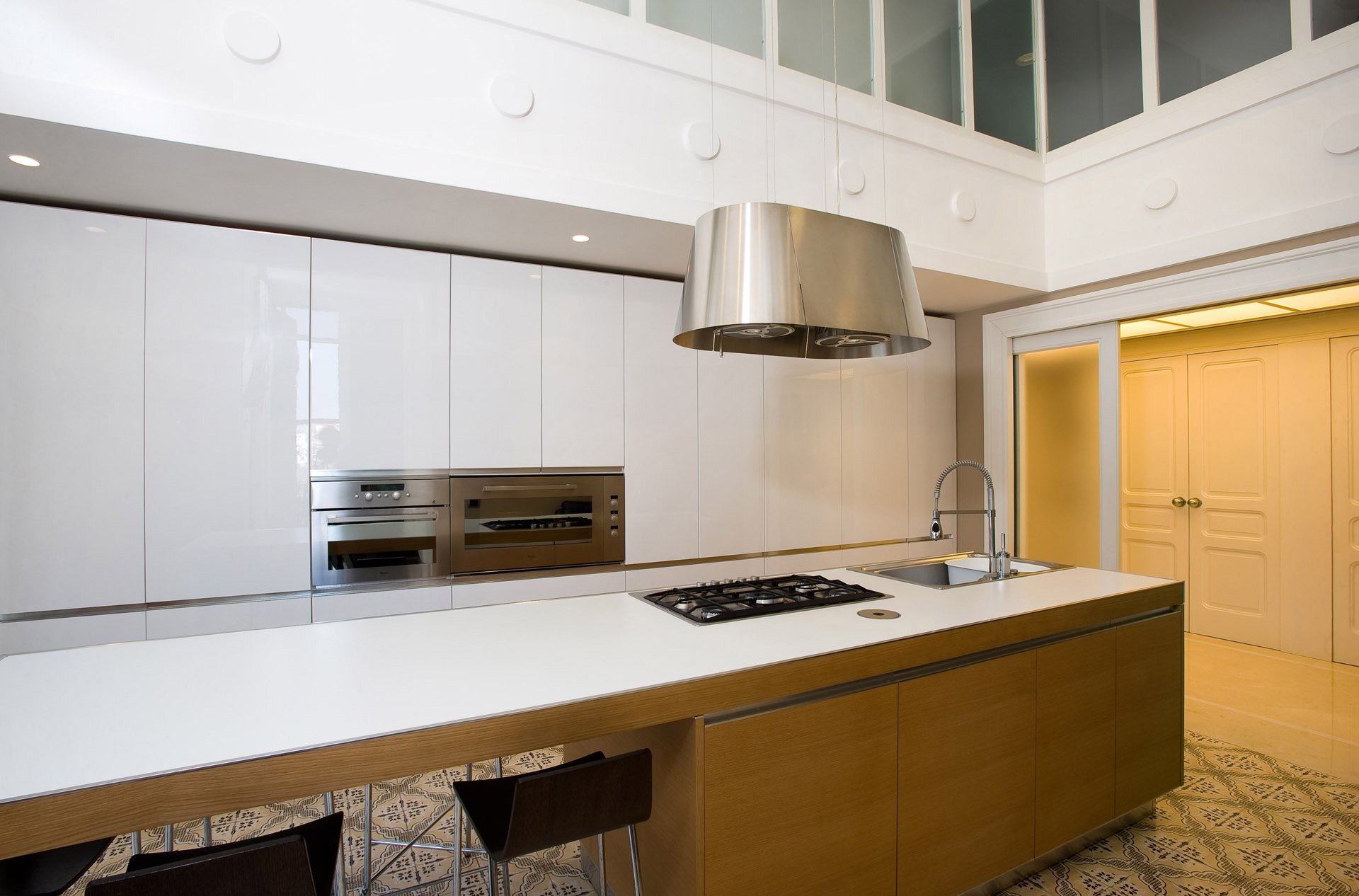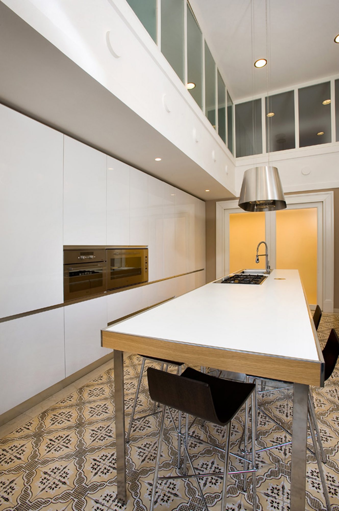 Questo ha permesso di ricavare spazi nuovi in dialogo e continuità con il piano sottostante: uno studio, una camera ospiti con bagno, una zona notte con spogliatoio di una delle due camere da letto del primo piano, e un ulteriore ed ampio spogliatoio a servizio esclusivo della camera padronale, anch’essa sviluppata verticalmente. Gli ambienti del soppalco si aprono, restando schermati all’interno, attraverso la vetrata in ferro e vetro opalino, alla luce della cucina ad isola centrale, con parete attrezzata a lato; mentre la sala da pranzo e il salone godono interamente della spazialità latitudinale