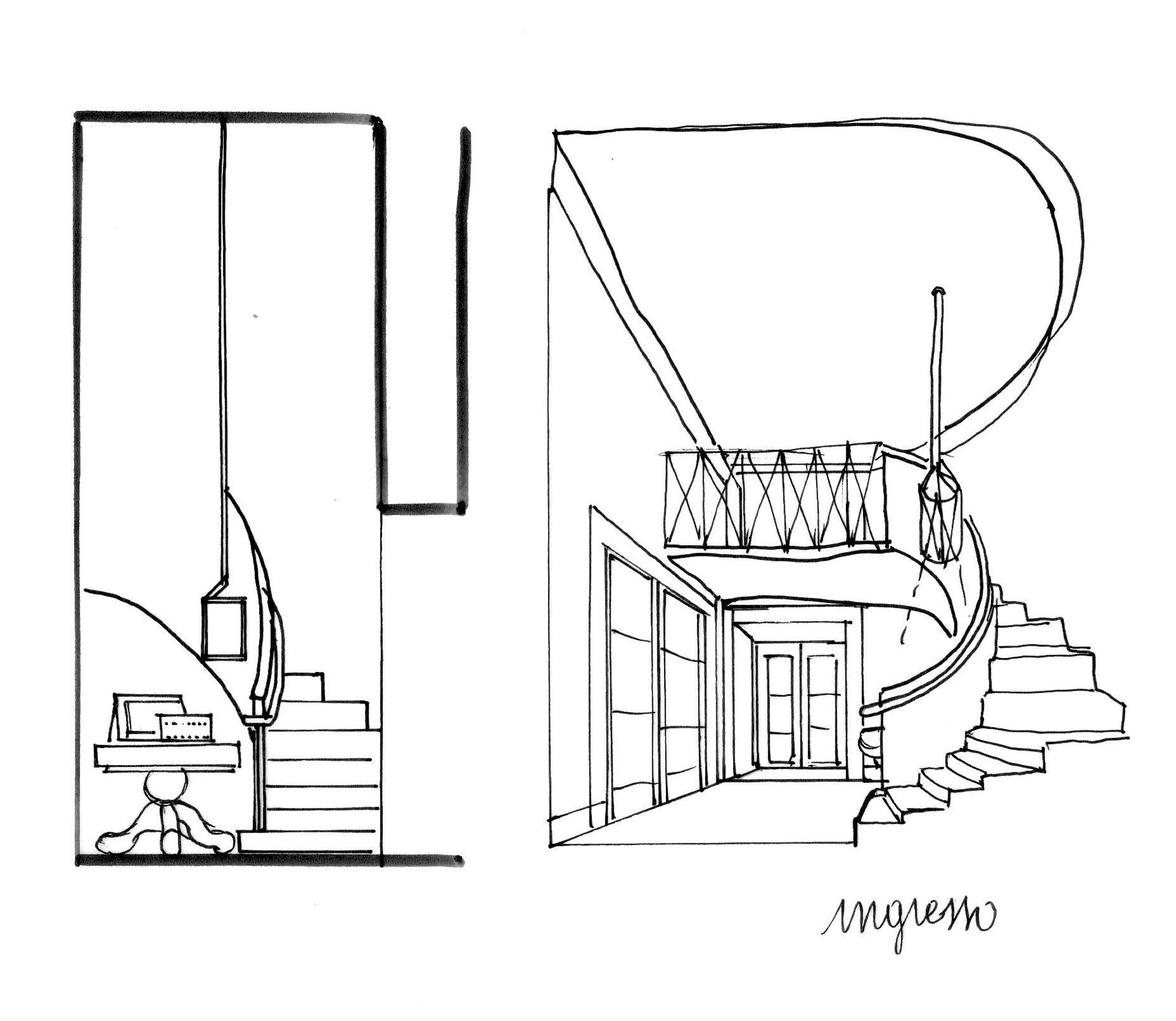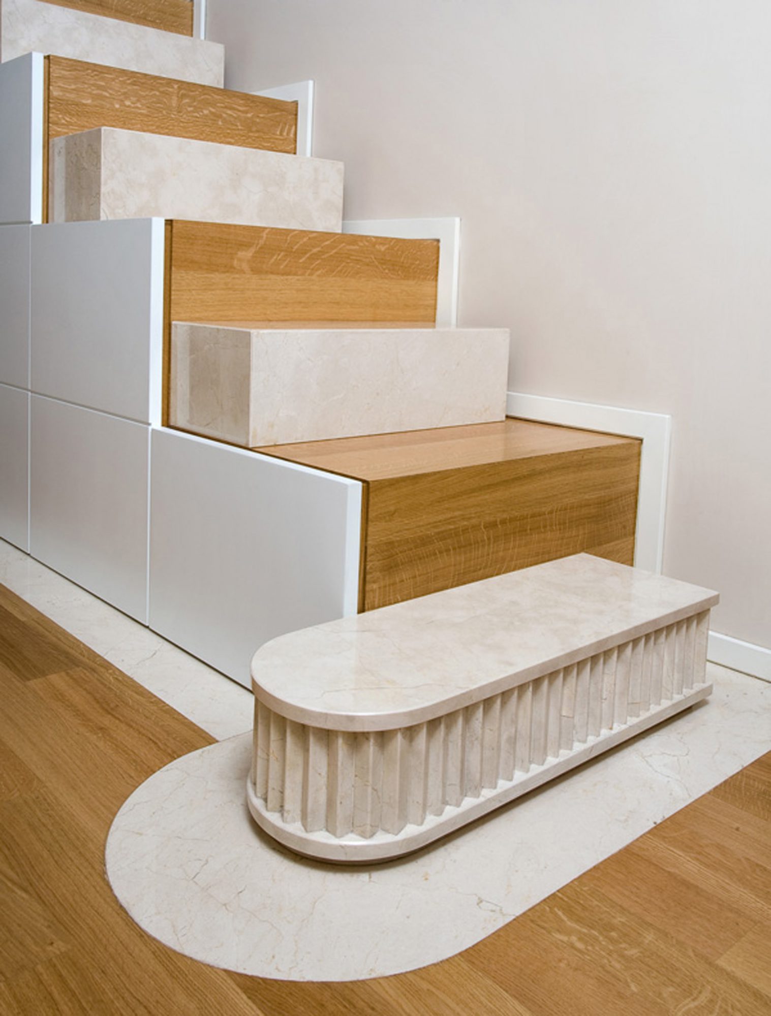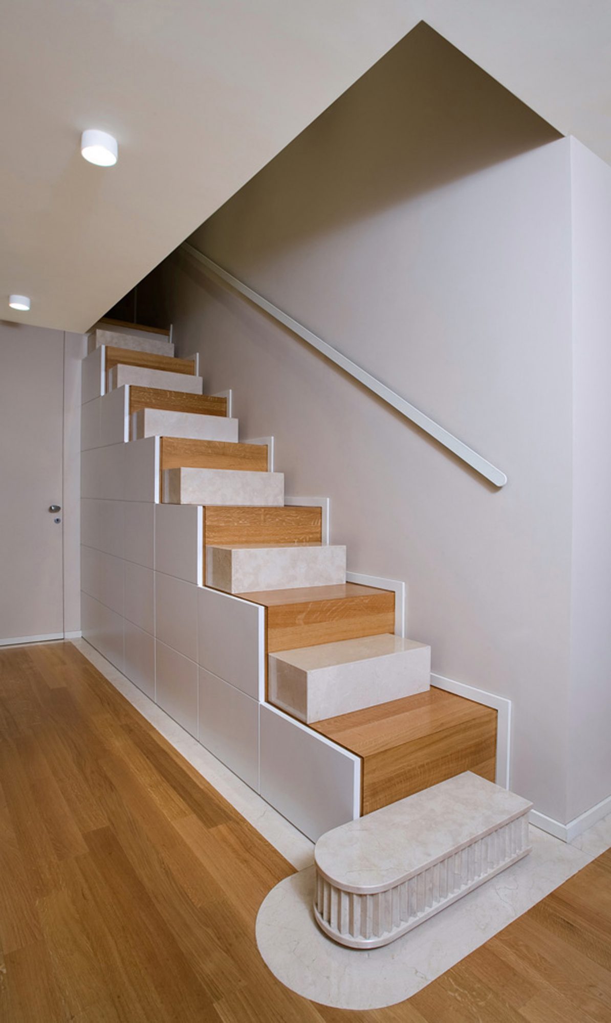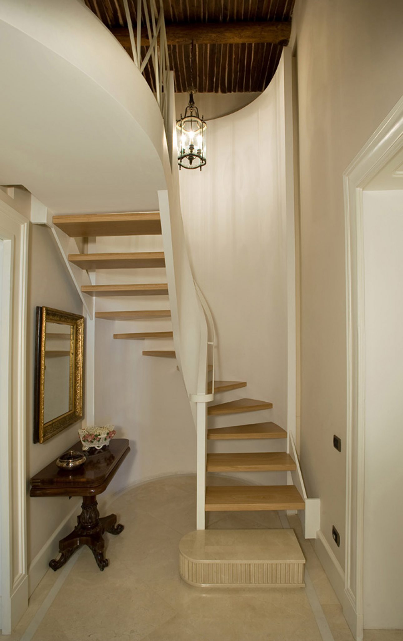 Tre scale sono state realizzate per accedere al soppalco. La prima si trova in ingresso e conduce allo studio e alla camera degli ospiti; è a forma elicoidale, in ferro e legno, e si conclude con la ringhiera rotonda del ballatoio. La seconda, che parte dal disimpegno delle camere e giunge alla zona notte della cameretta e al secondo accesso della camera ospiti, è in legno e blocchi di pietra, con il primo scalino interamente in marmo, e assolve anche la funzione di armadio-ripostiglio, "nascosto" nel sottoscala. La terza è nella camera padronale e porta allo spogliatoio interno alla stessa