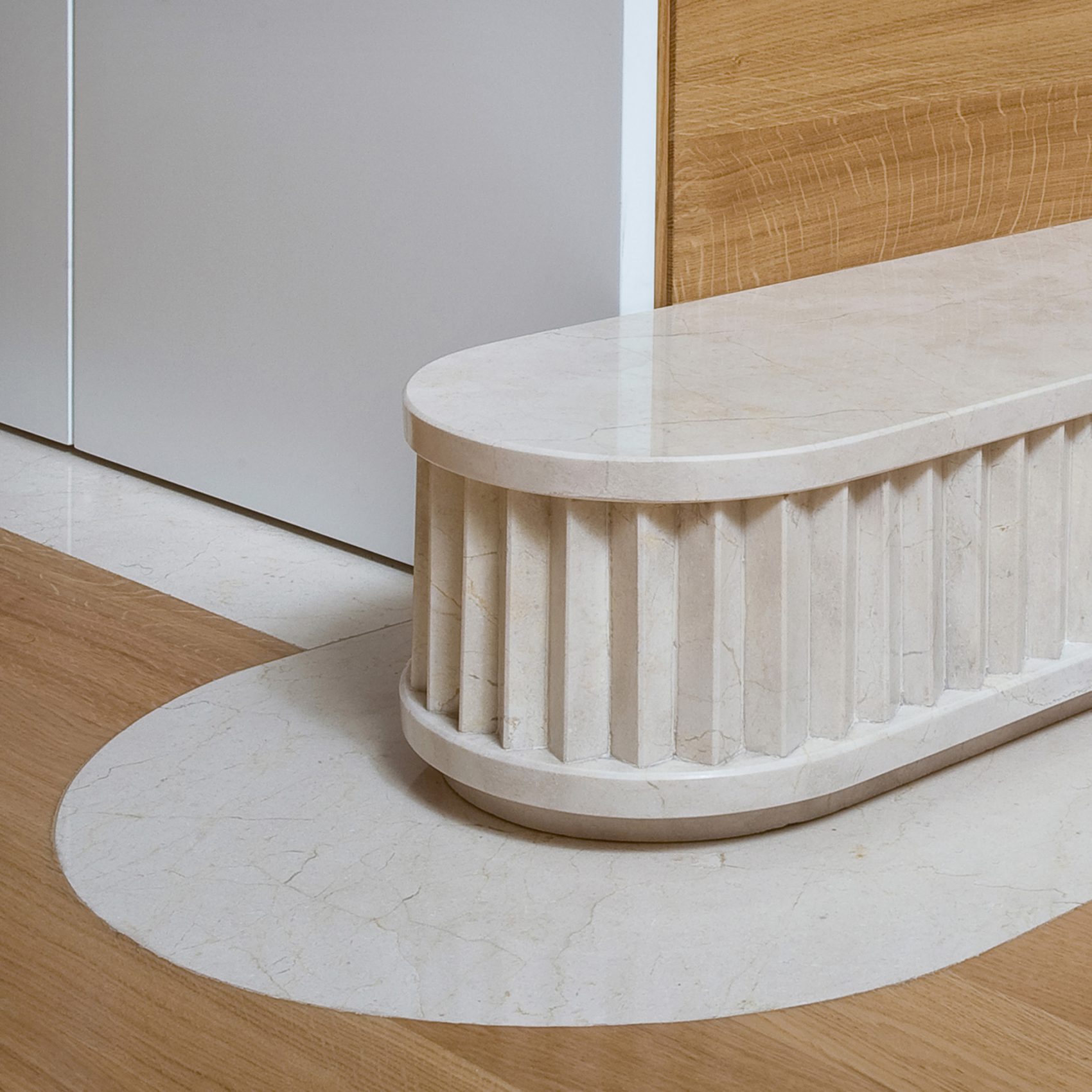 Nell’uso dei materiali, prevalentemente legno di rovere e marmo beige i Progettisti hanno ricorso anche — come in tutti i progetti dello Studio Ricciardi — alla tradizione locale, in particolare alle maioliche dipinte a mano che colorano il pavimento della cucina