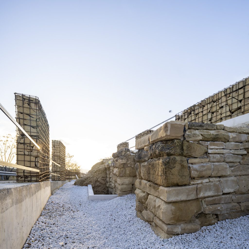Nel progetto si cerca semplicemente di aprire questa struttura ciclopica per farla conoscere. Viene inserita una leggera struttura che consente l'accesso ai visitatori durante il periodo di scavo. Una passerella, un muro di contenimento e un complesso processo stabilizzazione struttura guidano l'interno intervento