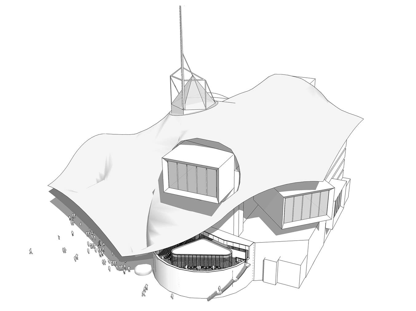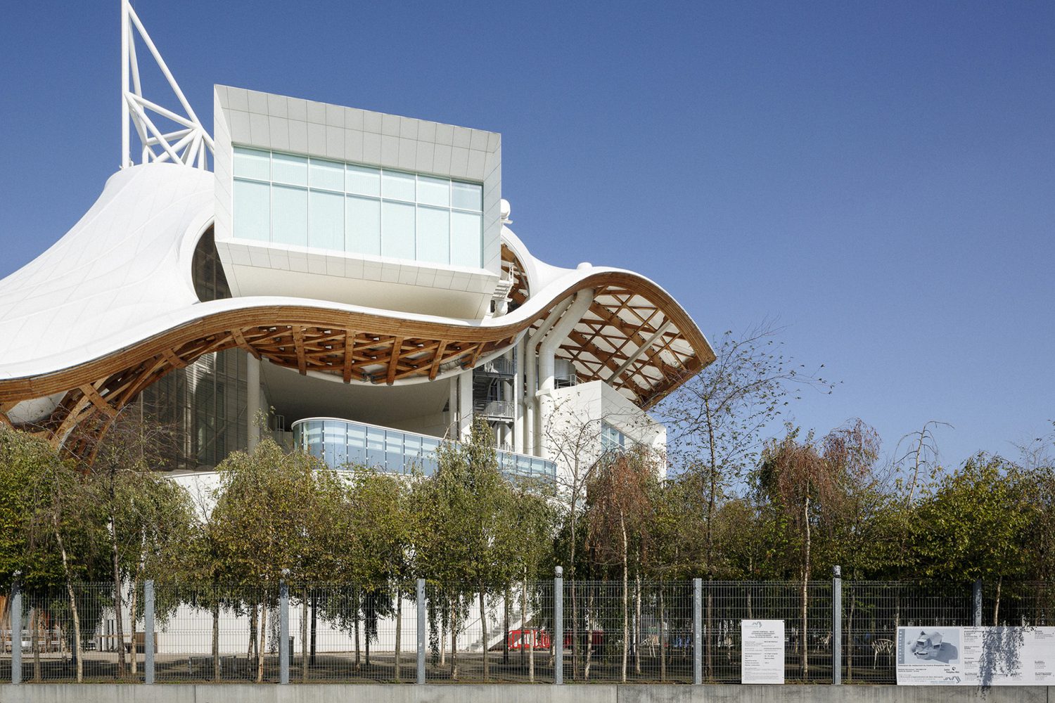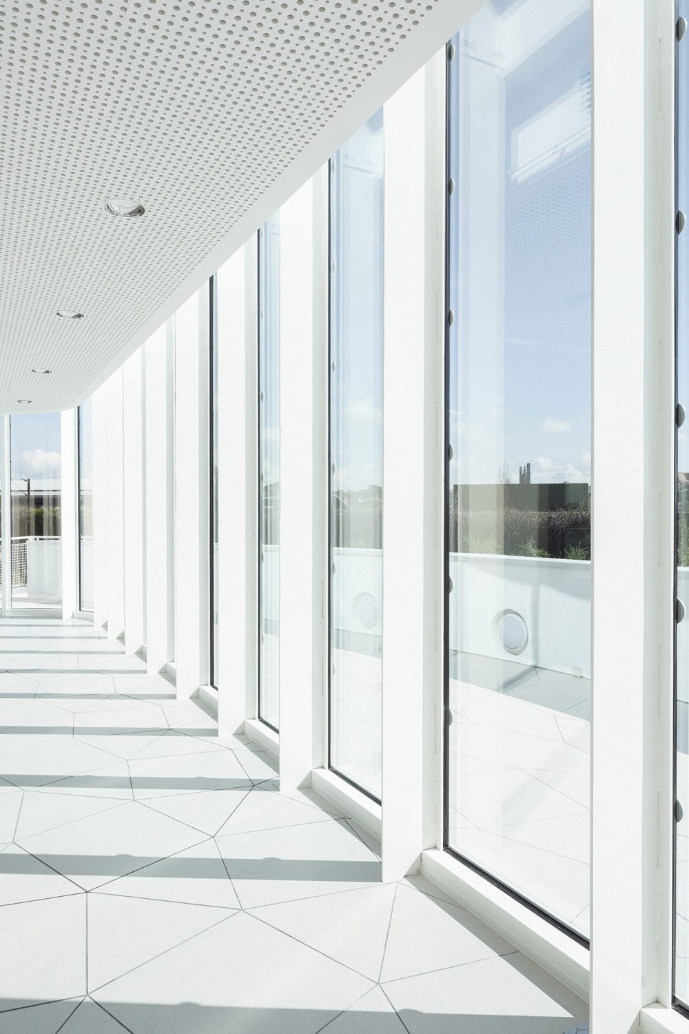 Il volume è formato da un monolite di vetro, chiaro e leggero, che lo rende radicalmente diverso dal Museo in termini di vocabolario architettonico e scelta dei materiali tra cui l'uso del legno, di grandi forme bianche e finestre incorniciate. Le facciate, astratte e intangibili, sono materializzate dai riflessi che si formano sulle forme chiare. Il tetto sembra inesistente, poiché il suo bordo è nascosto dalle finestre