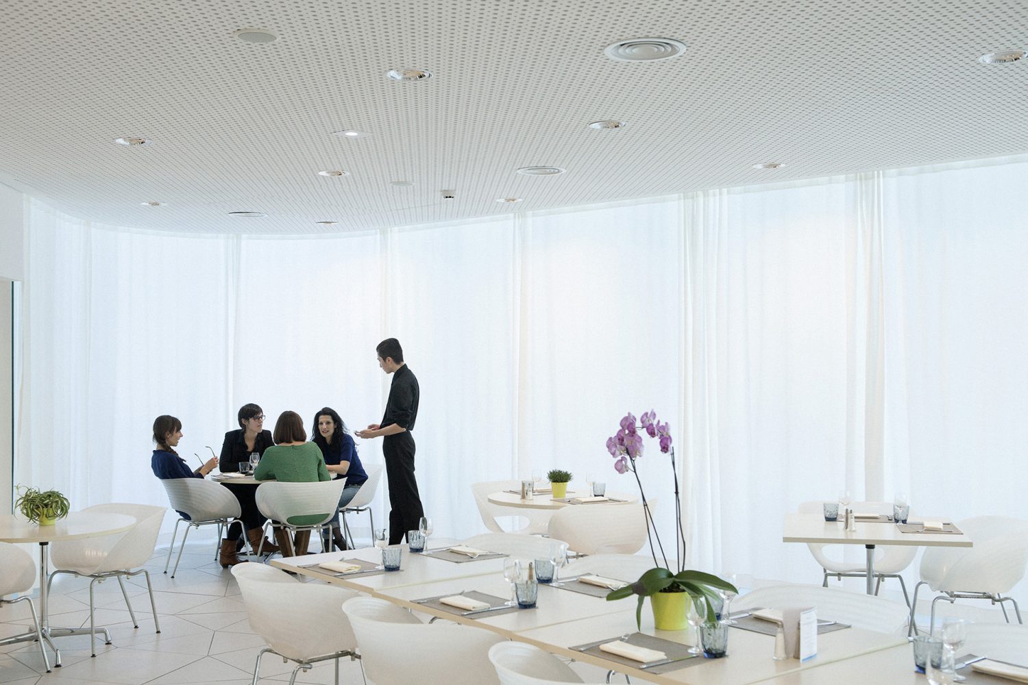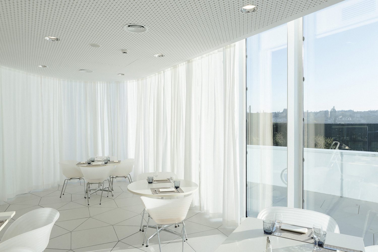L'atmosfera creata è un microcosmo formato dalla terrazza e dai suoi dintorni. Sebbene le linee che formano la volumetria architettonica siano semplici e pure, l’approccio più audace riguarda la scelta dei materiali: vetro e ceramica locali