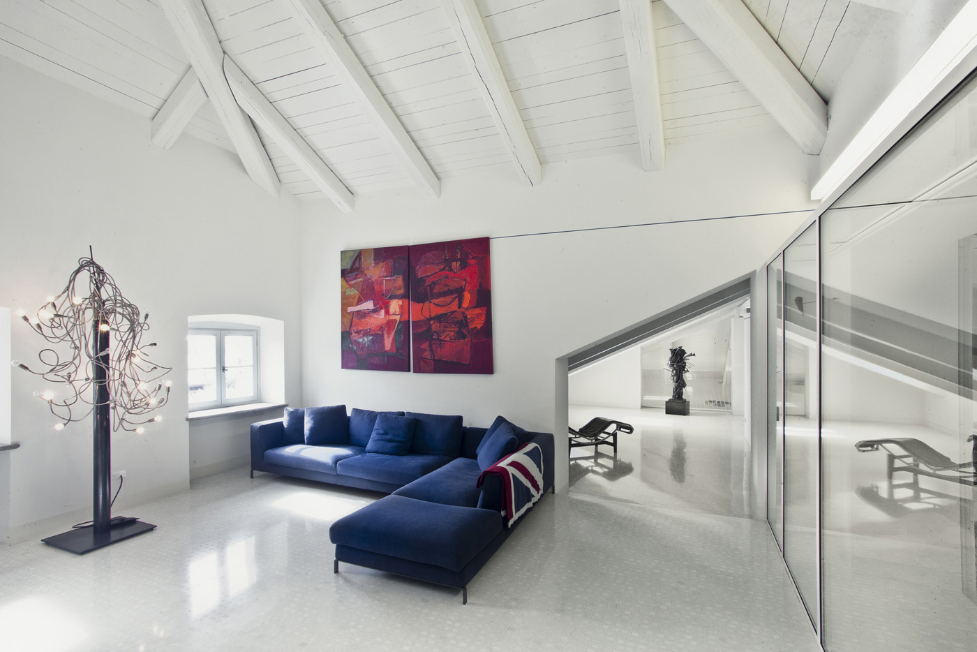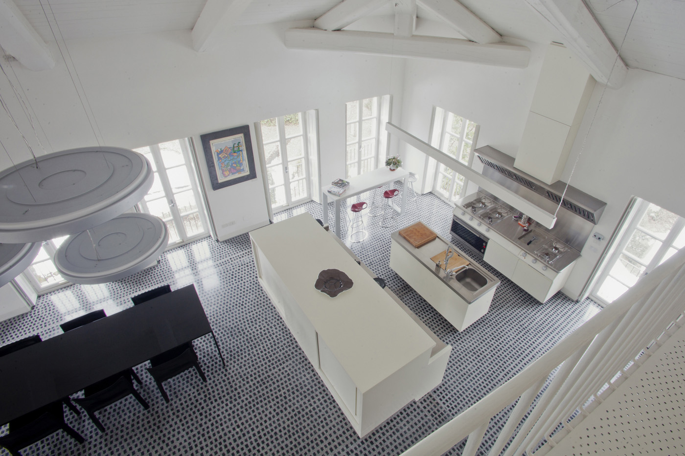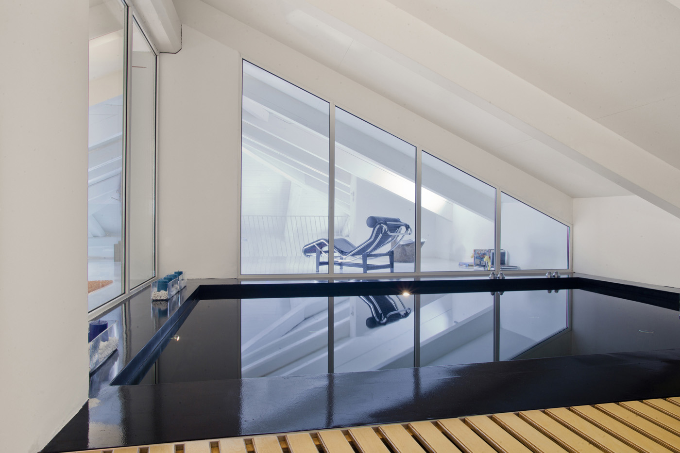 Il bagno turco è stato realizzato con una resina a smalto lucido rosso. La scala è stata progettata con con profili in ferro su disegno. Le porte sono tutte rasomuro. La piscina interna è stata progettata su misura e rivestita in resina nera. Il tavolo in carbonio è disegnato dall'Architetto Pietro Carlo Pellegrini. Nell'abitazione si alternano sculture di Lodola, Mitoraj e Arman