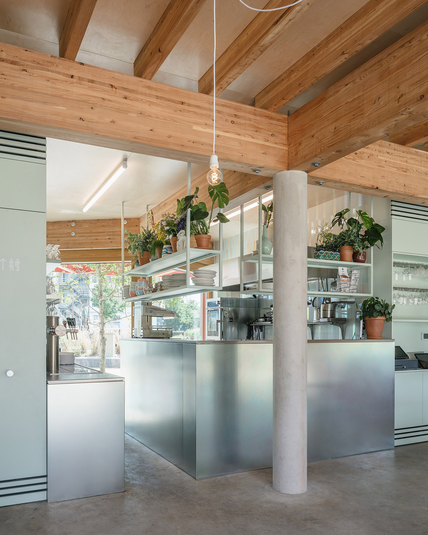Il padiglione Restobar Mama, progettato dallo Studio Ketting Huls, è composto da una terrazza circolare in cemento, un volume rettangolare e un tetto in acciaio circolare. L'edificio a forma di giostra si trova al centro della piazza ovale del parco, circondato da un lato dall'area giochi per bambini con fontane nascoste e dall'altro dai tavoli e sedie della terrazza