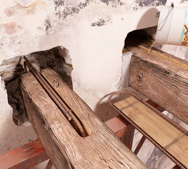 Spesso la parte della trave lignea inserita nelle murature presenta delle problematiche e, in casi estremi si ricorre alla sostituzione della parte deteriorata con una “sana”. Quest’ultima viene connessa con l’esistente tramite barre metalliche o piastre opportunamente disposte e resina adesiva