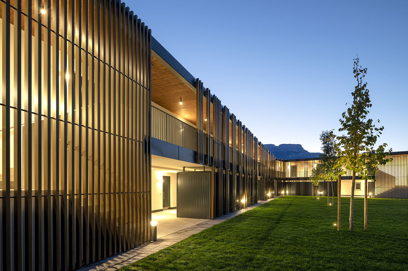 Il “vecchio” comunica così e interagisce con il “nuovo” e accoglie quest'ultimo al suo interno, mantenendo una certa distanza rispettosa che crea spazio per spazi nuovi e interessanti. La luce entra all'interno del fienile attraverso tagli geometrici deliberati nel tetto e nelle pareti della struttura esistente. I due nuovi edifici incarnano l'evoluzione stilistica, caratterizzata da ampi terrazzi e da una facciata il cui ritmo è interrotto da listelli verticali color bronzo che salgono fino al tetto e si alternano alla struttura portante in legno lamellare