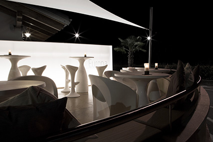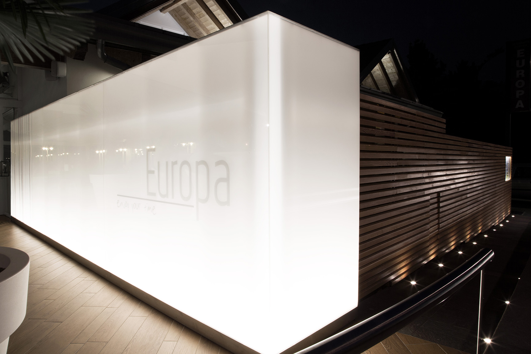 Un elemento lampada, realizzata in acciaio inox e vetro, arricchisce ed accompagna i clienti all’ingresso del locale