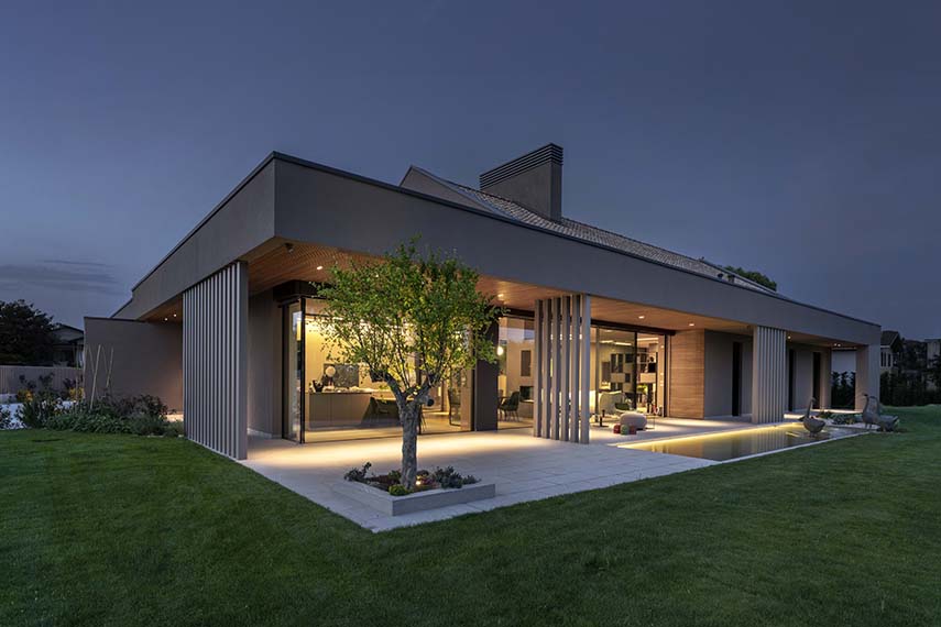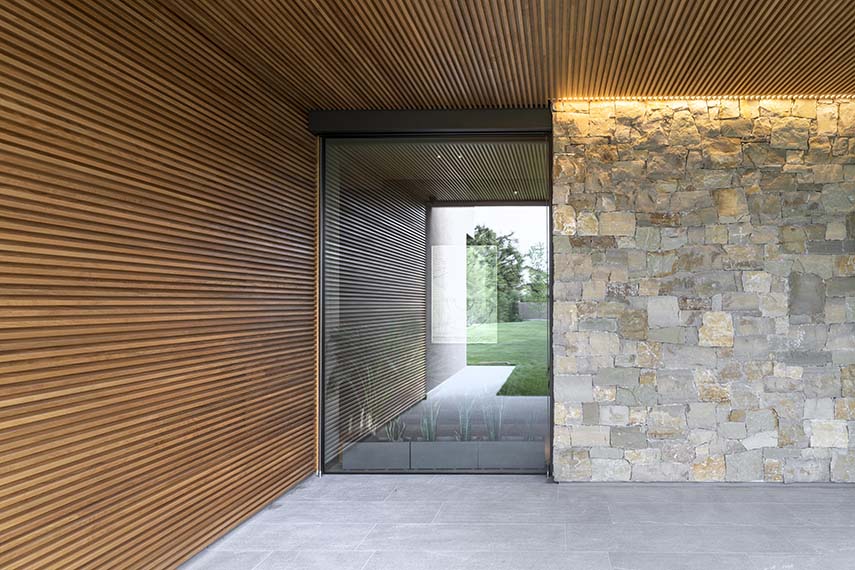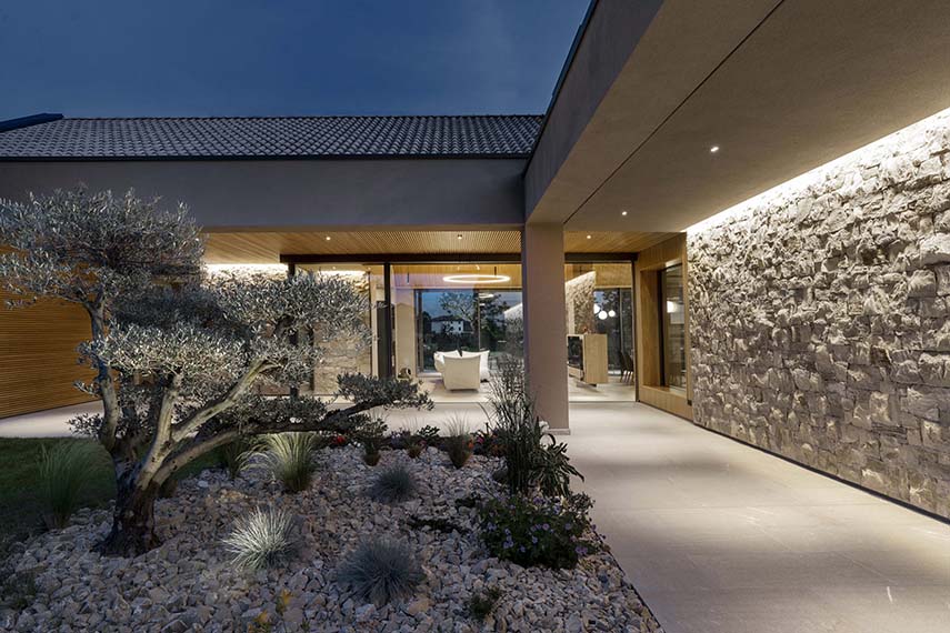 Il progetto per la villa, realizzato dallo studio dell’architetto Duilio Damilano, prevede l’ingresso a nord con un percorso pedonale separato dall’ingresso destinato alle auto, attraversando un lungo porticato affiancato da un muro rivestito in Pietra di Credaro a spacco naturale. Tutta la pavimentazione esterna, compreso il fronte dell’autorimessa, è in lastre di pietra Piasentina, tipica del luogo