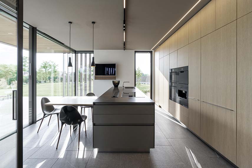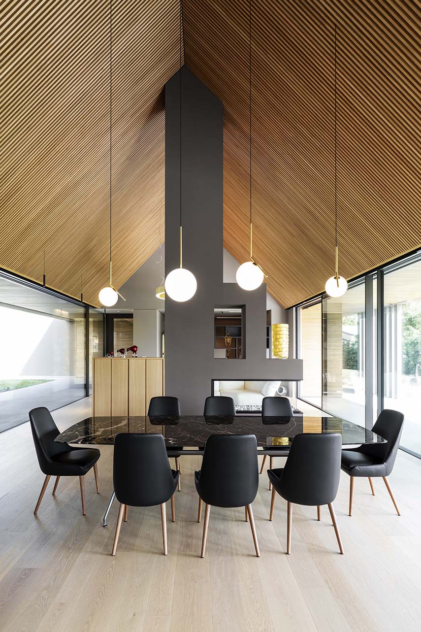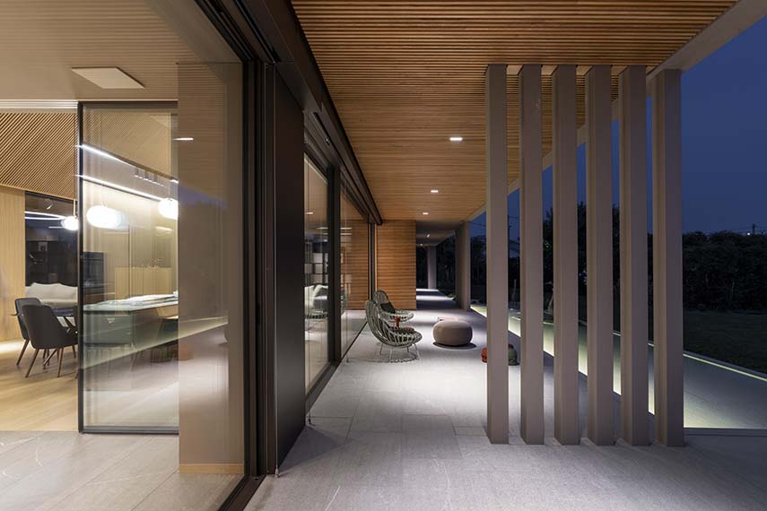 Il soggiorno, nucleo centrale dell’abitazione, è interamente vetrato sui fronti sud e nord permettendo costantemente la vista del giardino, anche attraverso il volume costruito. A destra del soggiorno, separati dal camino, si trovano la sala pranzo, la cucina ed alcuni spazi di servizio insieme all’accesso all’autorimessa. A sinistra la zona notte con due camere separate da un bagno comune destinate ai nipoti e una camera padronale con accesso dalla cabina armadio con un bagno privato collegato all’area fitness