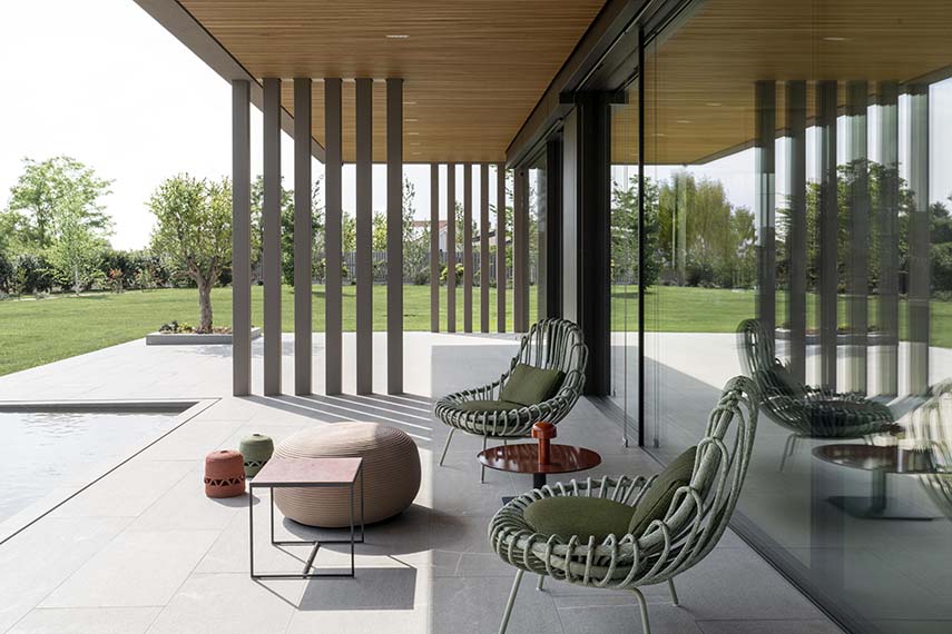 L’abitazione si trova ai limiti di un piccolo centro abitato circondato da numerosi vigneti destinati alla produzione del Prosecco in Friuli. Il progetto “I giardini di Rita” nasce dal desiderio del committente, un imprenditore molto attivo, di creare un’oasi di relax per il fine settimana dove riunire la famiglia ed evadere dalla routine quotidiana