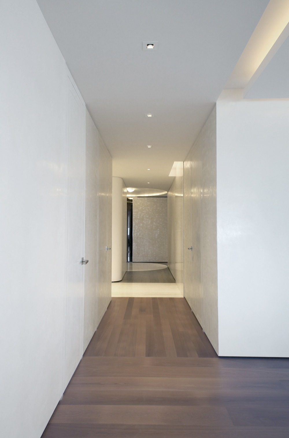 L'appartamento è il risultato di due unità combinate, collegate da un corridoio centrale che condividono. Questo layout ha presentato l'occasione perfetta per evocare architettonicamente l'acqua che scorre nel foyer d'ingresso