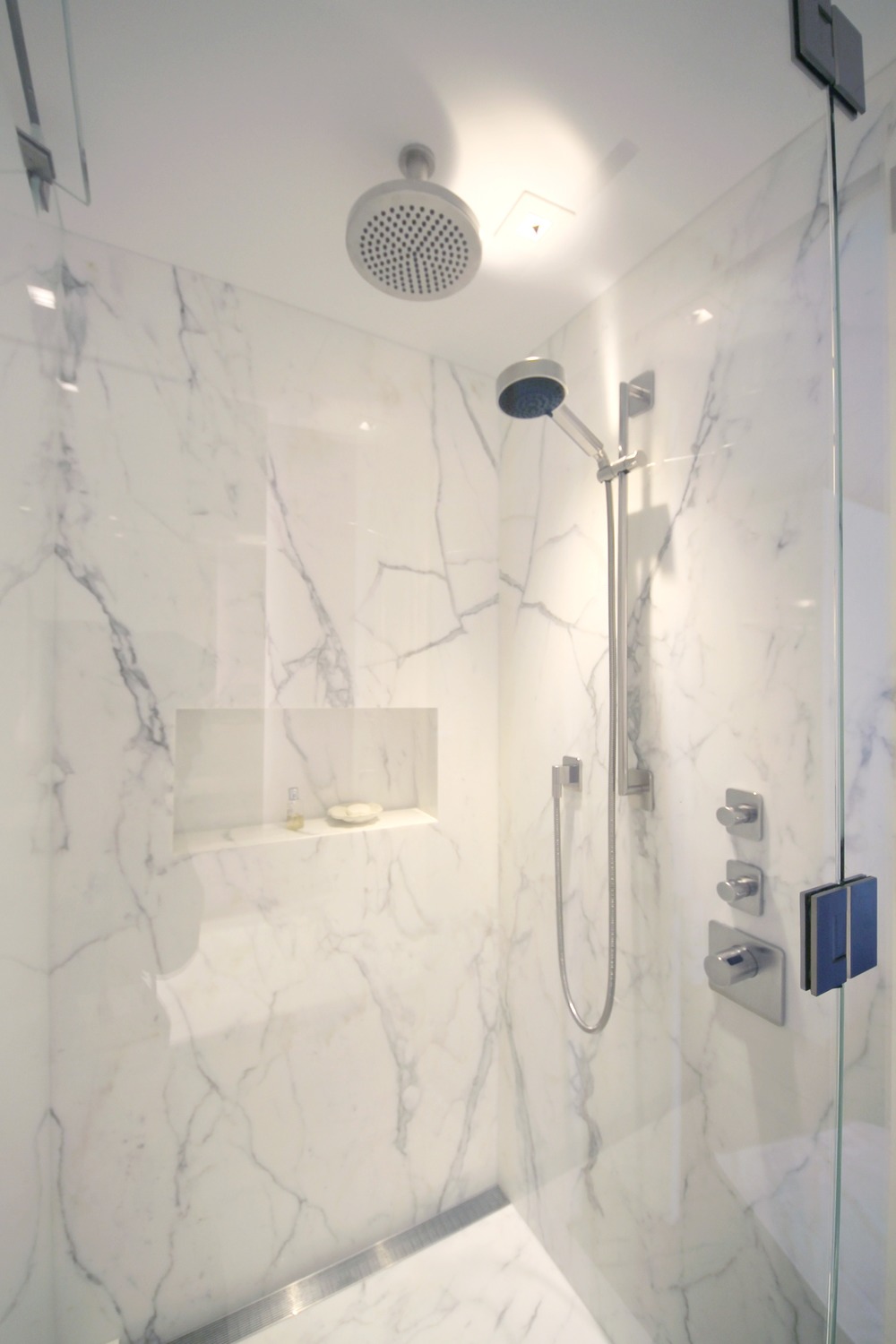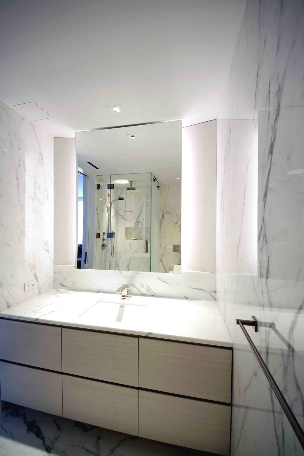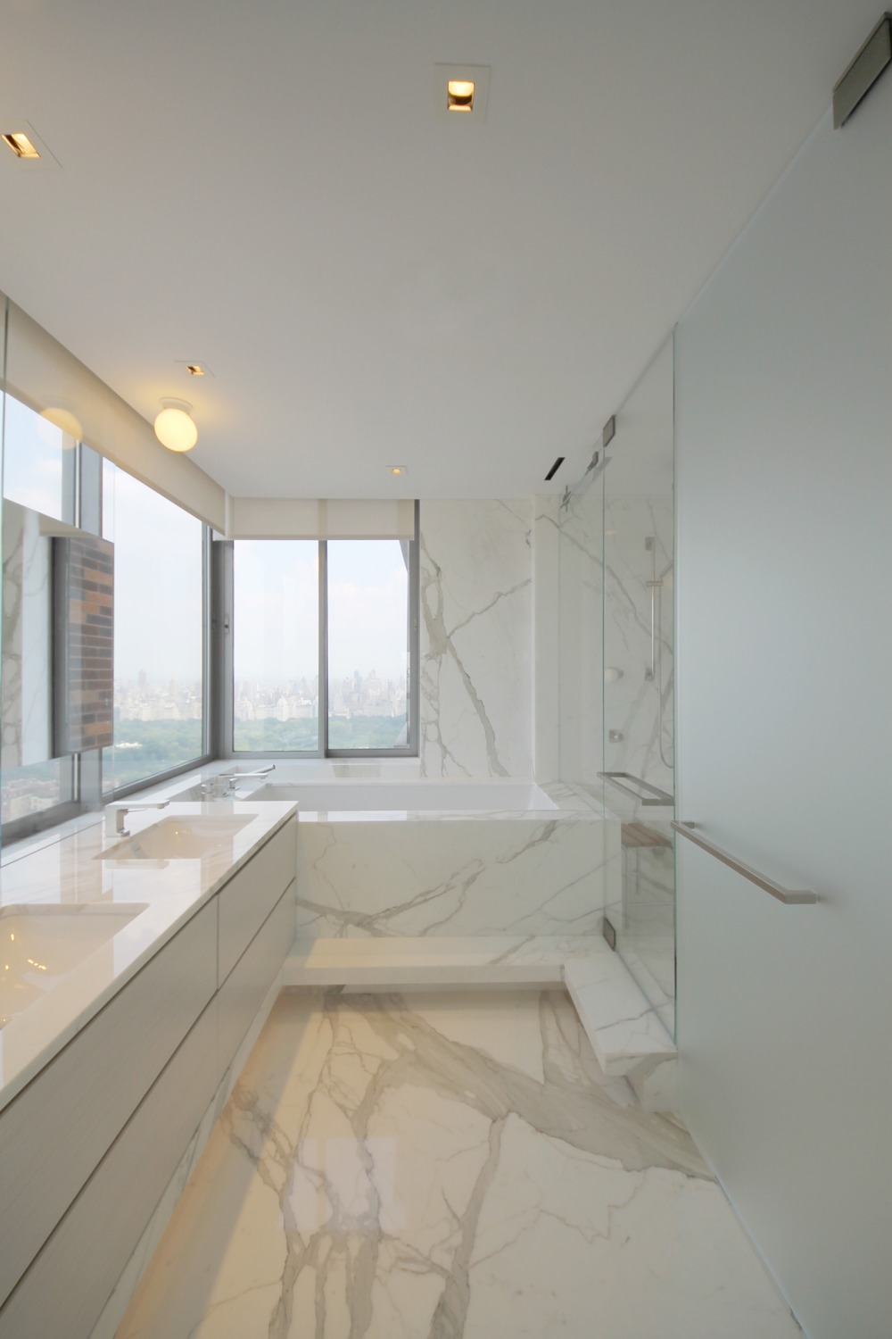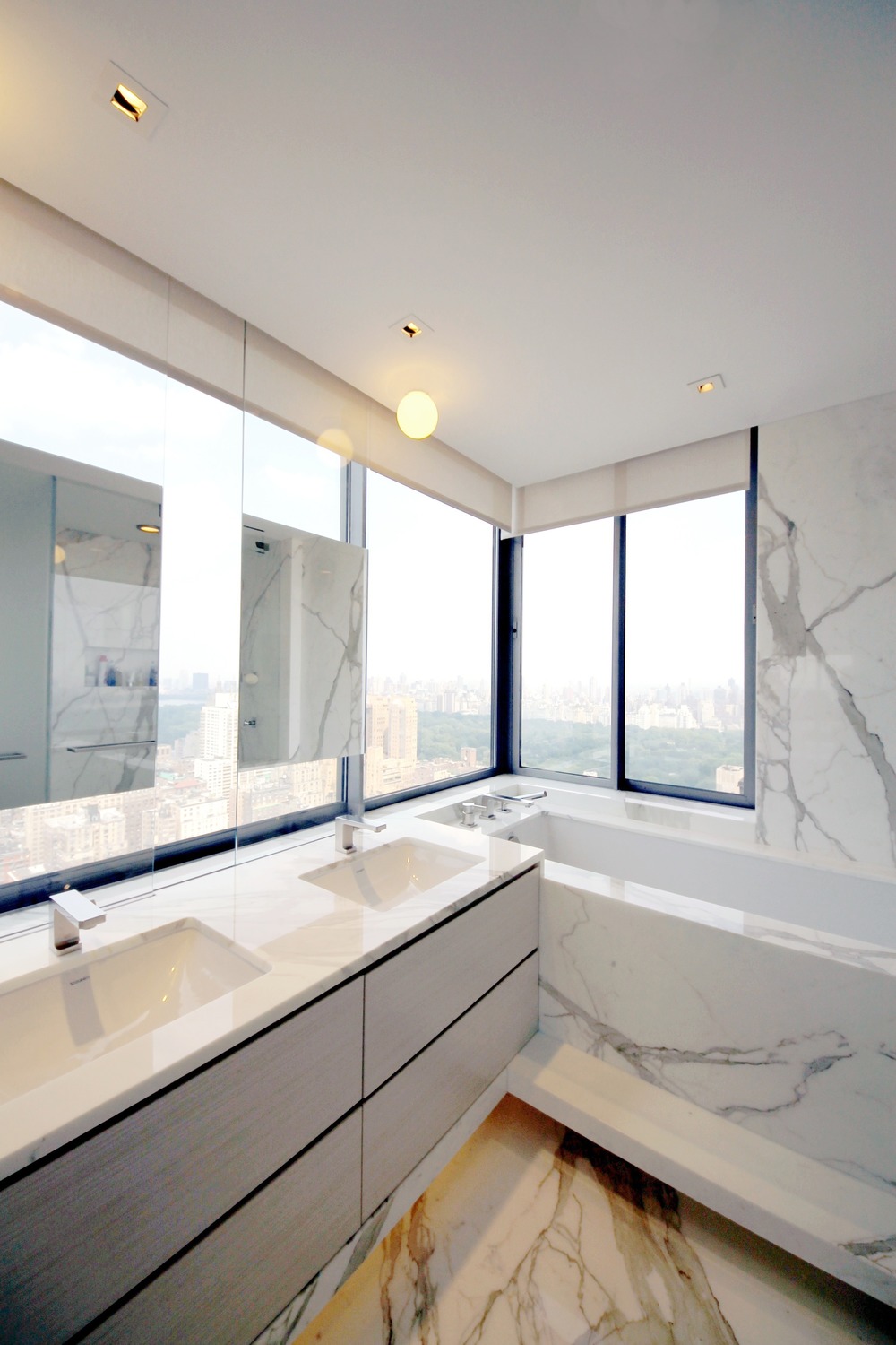 La rotonda circolare è stata creata con le pareti / porte curve di Macassar e il soffitto a cupola al centro del corridoio. In cinque bagni su sei sono state utilizzate varietà di lastre di pietra di Onice bianca, Nero Dorato, White statuario, Calacatta Gold, Honey Onyx e Brazilian White. Nel bagno principale gli specchi scorrevoli massimizzano la vista di Central Park per il proprietario mentre lei si rilassa nella vasca da bagno