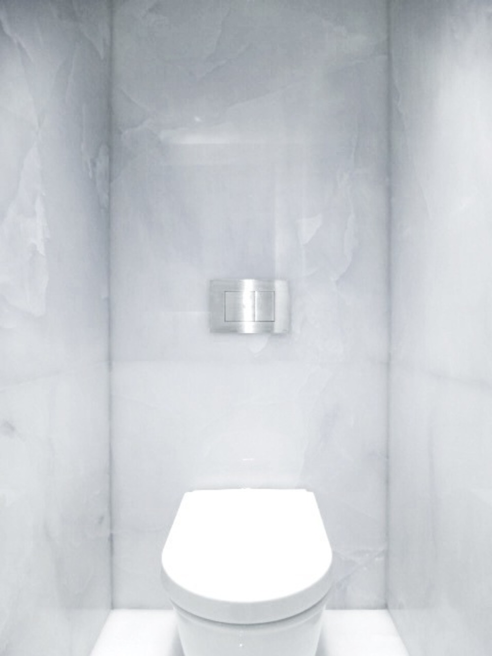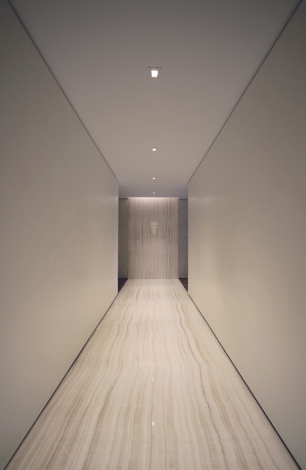 Nello stesso momento in cui stava valutando il lavoro su questo appartamento, Kitada aveva fortunatamente appena scoperto lastre di pietra di Vanilla Onyx. Il loro colore e la loro grana eccezionali evocavano il flusso dell'acqua. Quella pietra è trasfusa con un colore morbido trasparente mentre trasmette anche forza dinamica. Ha dimostrato di essere la chiave per trasformare l'idea in realtà. Inoltre, per coincidenza, il proprietario voleva avere una caratteristica simile all'acqua all'ingresso dell'appartamento in feng shuistile