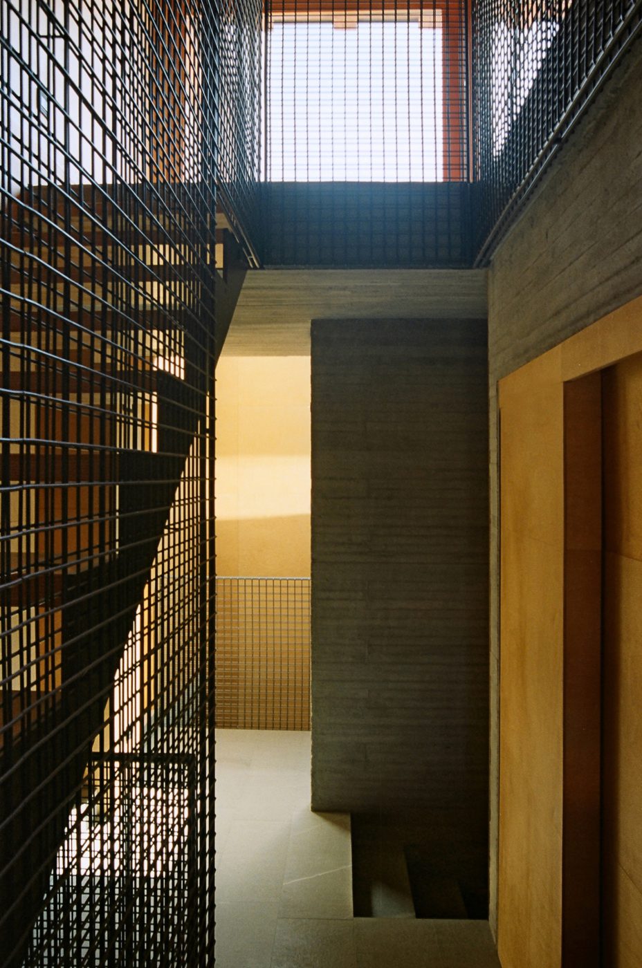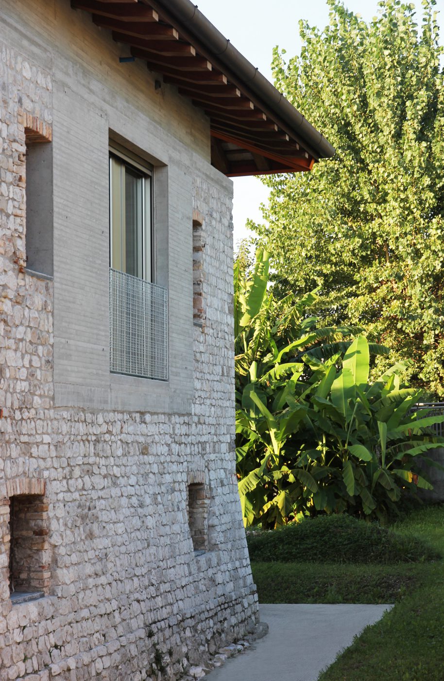 Le scatole in cemento armato a vista si manifestano in modi diversi all’esterno: rompendo in alcuni punti l’involucro originario e aggettando, fermandosi a filo della parete in sassi, occupando parte del portico