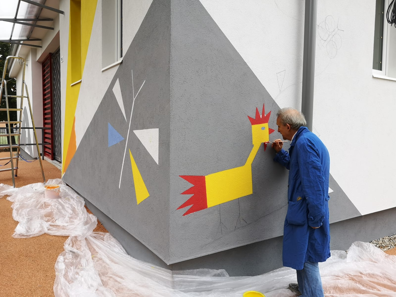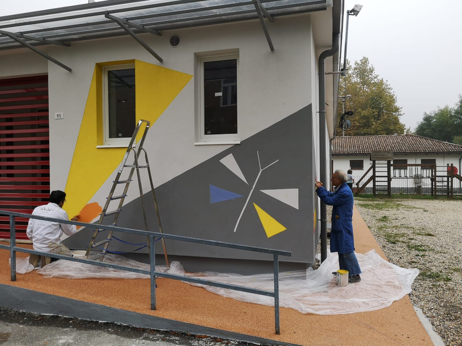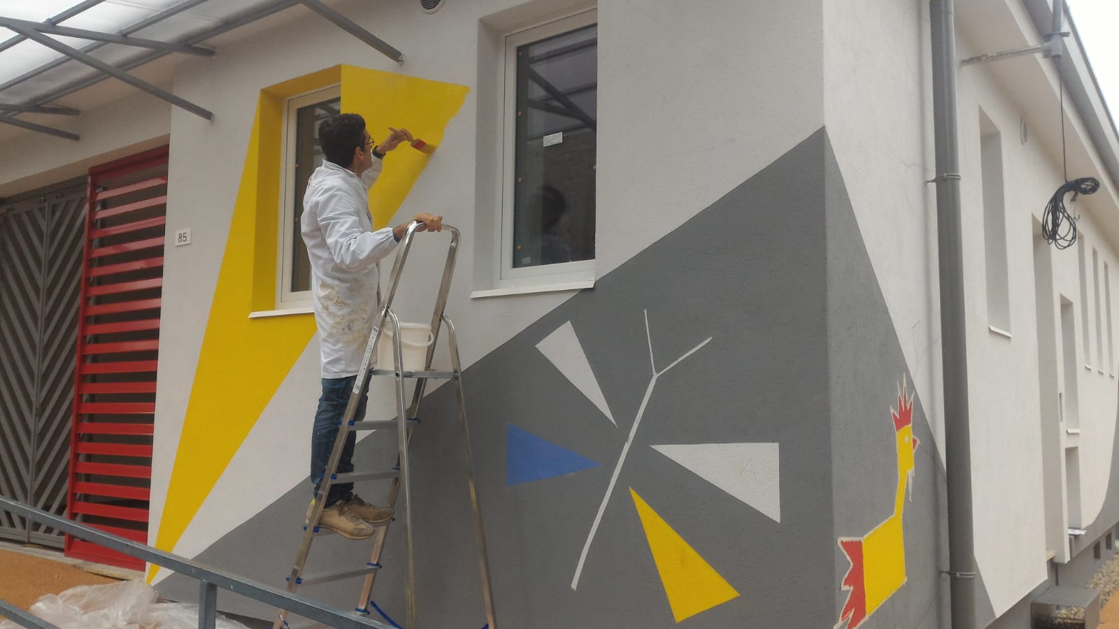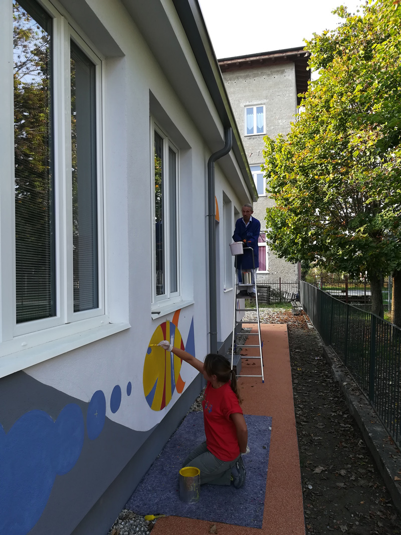 Per le finiture esterne, di rilievo è stata la collaborazione tra alunni e maestre, che hanno provveduto a decorare la propria scuola personalmente durante appositi laboratori con colori caldi e con motivi geometrici o dalla morfologia animale