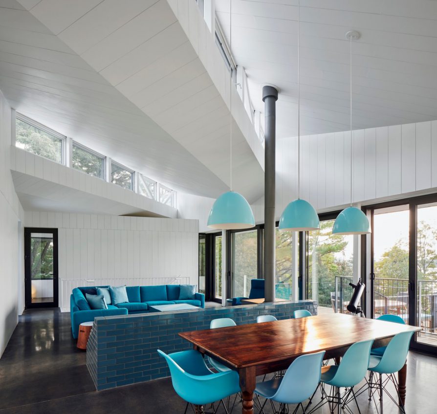 Elementi giocosi sono collocati in tutto da uno zoccolo di mattoni smaltato per la stufa a legna, ai ganci appendiabiti colorati sparsi e una panca girevole personalizzata