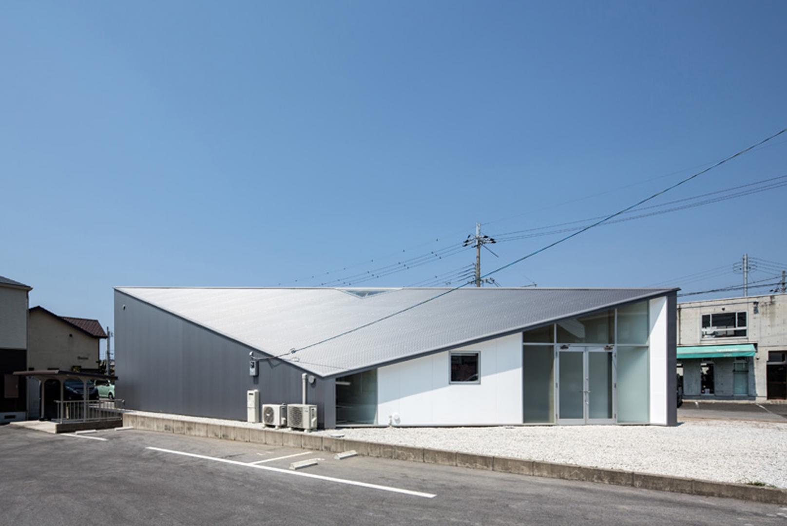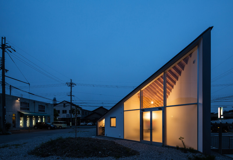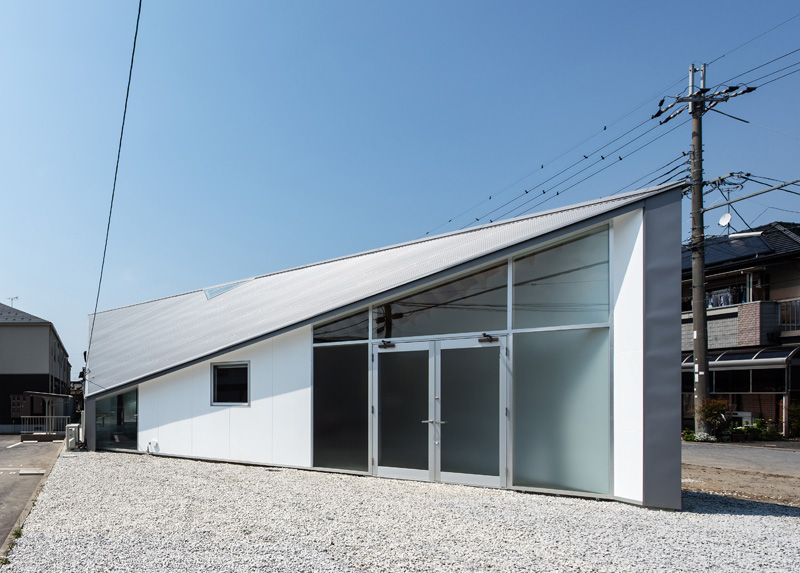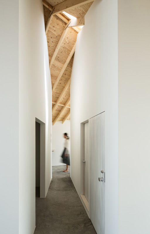 La planimetria ha la forma di un parallelogramma, e la cresta del timpano è la sua diagonale. Il volume è stato diviso in tre parti longitudinalmente, e il nucleo centrale si interpone tra residenza e atelier. L’atelier, che necessita di un notevole apporto di luce naturale e di un soffitto alto, è stato posizionato a nord, mentre a sud, dove la radiazione solare è maggiore, è stata progettata la parte residenziale