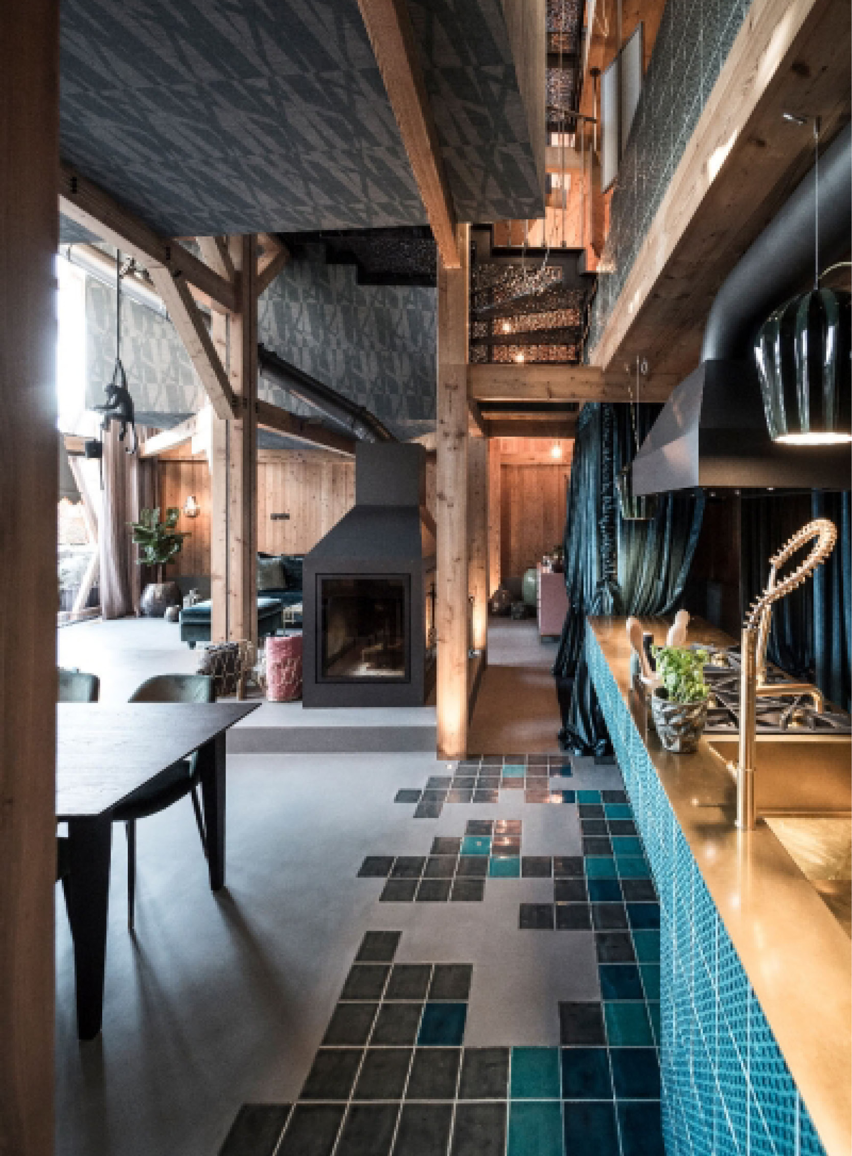 L’interno è un vero gioco di affacci e di variazioni di livelli, tra ironia e fantasia, dove le zone private sono situate in cubi sospesi nello spazio libero che si ispira alla ‘piazza’, centro di scambi e connessioni. Con questo gioco di volumi, dal soggiorno a tutta altezza, lo sguardo attraversa dodici metri di viste e intersezioni fino alle travi del tetto