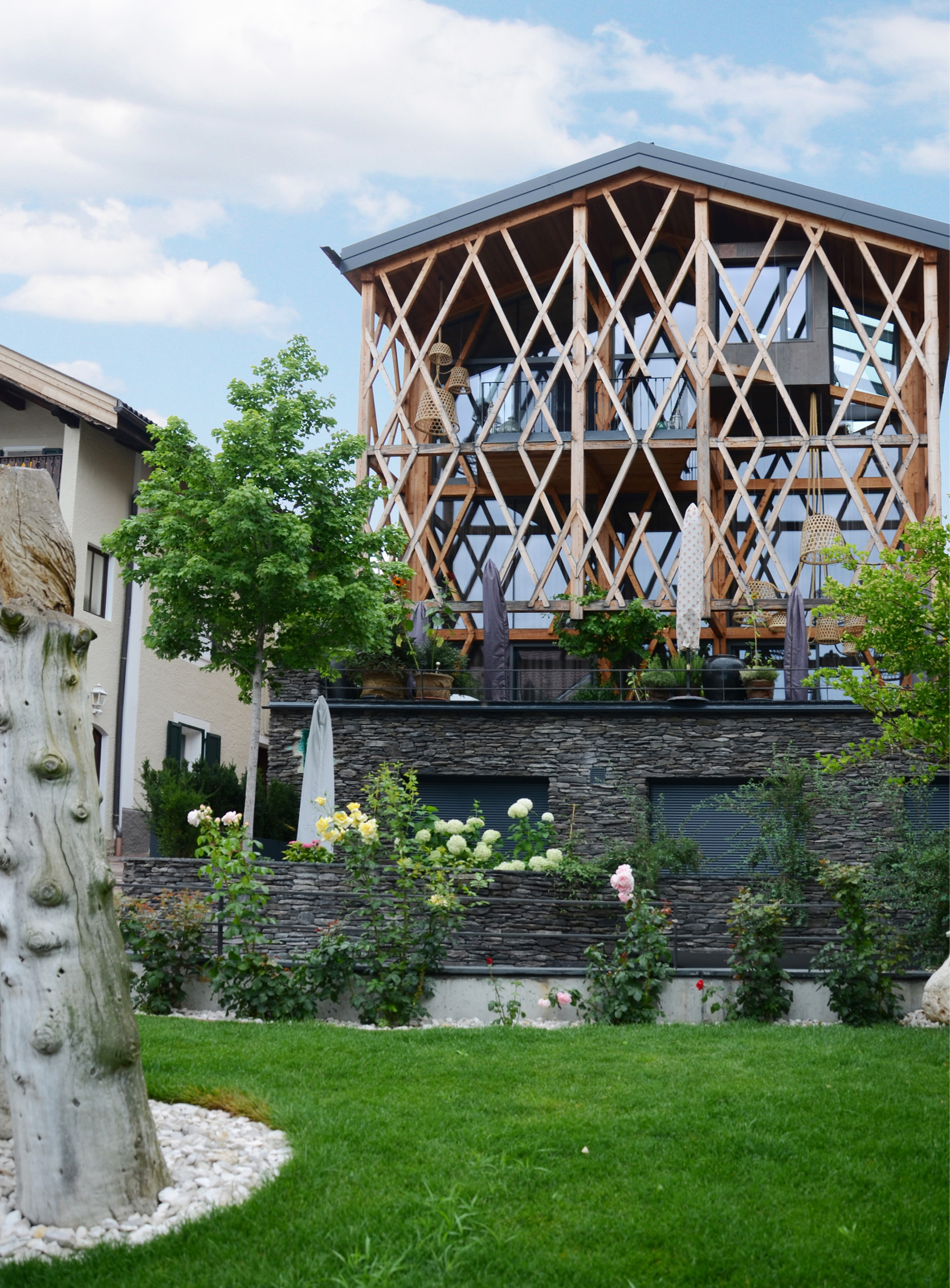 L’architettura presenta una solida base in pietra Geopietra e una struttura in legno che si erge per tre piani tra finestre e balconi, mescolando fattori molto diversi, sia a livello emozionale che strutturale
