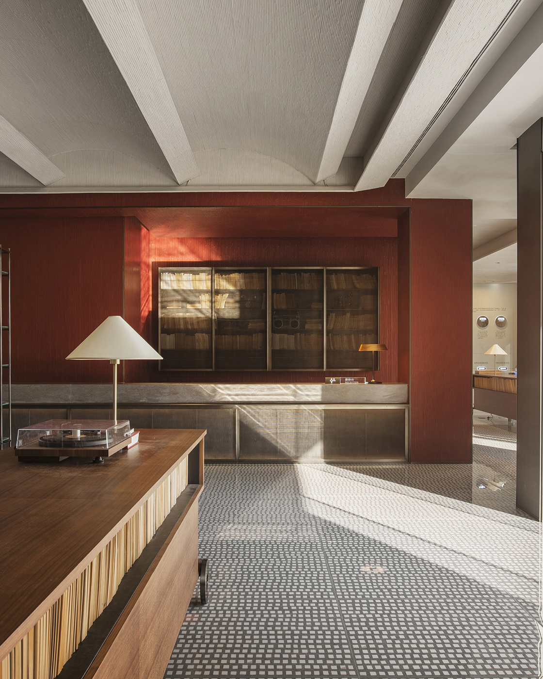 A destra dell’ingresso troviamo l'angolo rosso-ambra che stacca dal caldo grigio e bianco sporco neutro della stanza. La zona della reception è fatta di sottili strisce di bambù per creare uno stacco materico. La forte” temperatura” del rosso sale a spirale sulla scala, dove alti scaffali espongono stampe che rappresentano la storia della vita di Fuzhou e le alcuni cimeli culturali