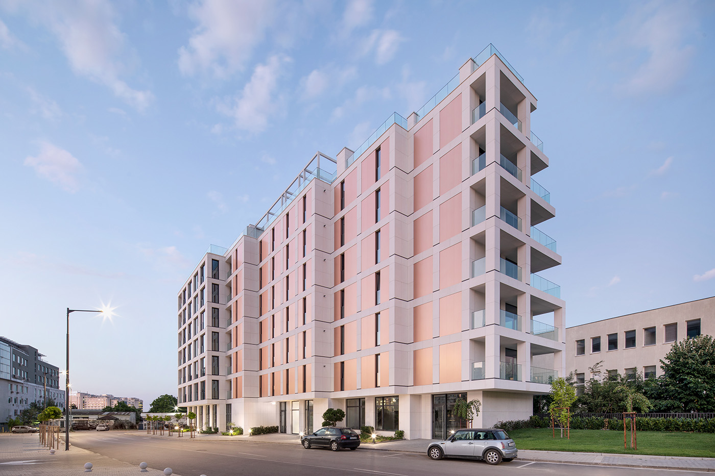 I materiali e i colori dell'edificio sono stati scelti in armonia con il contesto, dominato dal vicino centro uffici. Nonostante i complessi parametri urbanistici e i loro limiti, che rappresentavano la sfida più grande di questo progetto, non sono stati fatti compromessi nella progettazione architettonica e nella funzione. Tutti i dettagli sono pensati con cura per enfatizzare il concetto architettonico equilibrato di Srebrna 18