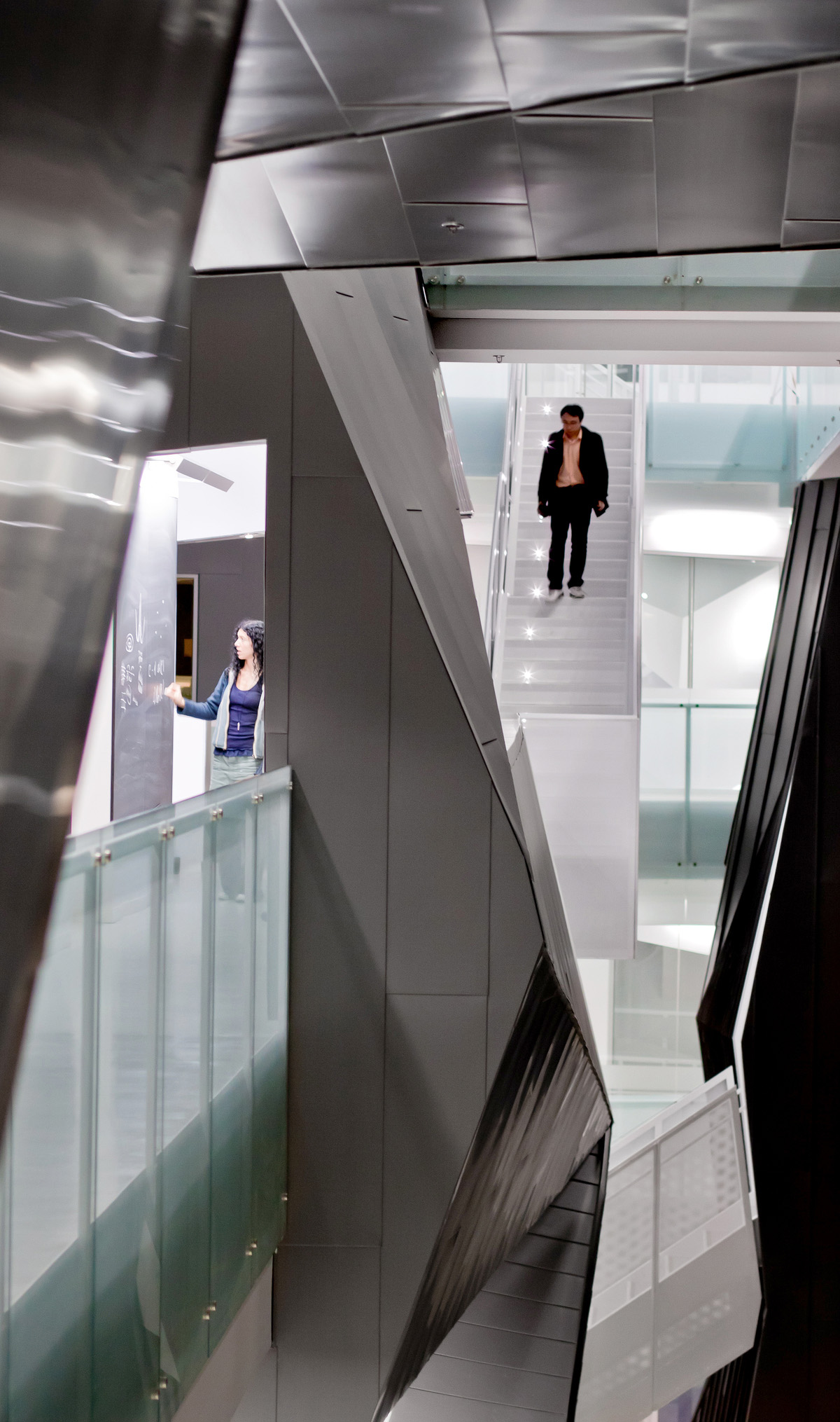 Le aree di interazione a mezzo livello sono visibili direttamente dalla sequenza di ingresso dell'edificio, creando un forte senso dinamico. Una decisione progettuale chiave è stata quella di spostare il nucleo sociale dell'edificio, la caffetteria, dalla sua precedente posizione al 4° piano al piano terra, come parte della sequenza di ingresso, facilitando sia gli incontri pianificati che quelli spontanei