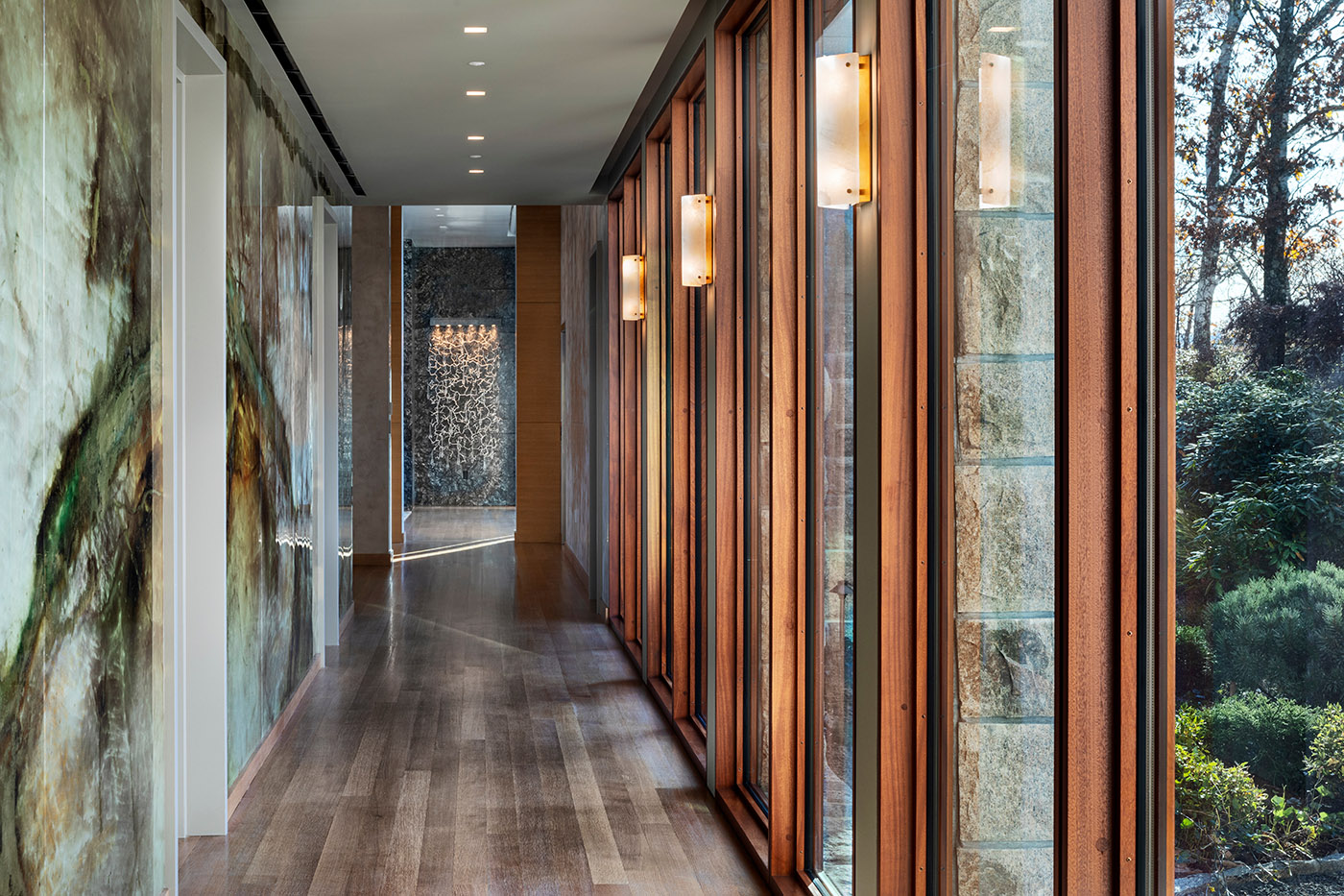 Incastonata nella roccia del sito in forte pendenza, la Sterling Forest House, grazie al suo rivestimento in granito color grigio e salmone, il tetto verde e le finestre in mogano, si dissolve nella natura